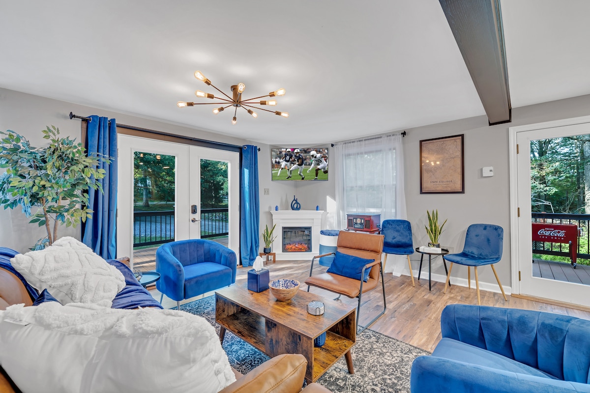 📍 A 3 millas de PSU y Beaver Stadium 🛁 Jacuzzi privado (cerrado y resistente a la intemperie) 🎮 Sala de juegos 📺 sala multimedia multipantalla Lugar para hacer🔥 fogata 🍽️ 2 cocinas totalmente equipadas 🍸 Wet bar ☕ Bar de café y té 🍕 Cocina al aire libre: parrilla, freidora de aire y horno para pizza 🌿 Terraza amplia 🔥 Chimenea interior. 🦁 Fan Cave de PSU ⛳ Juegos al aire libre (cornhole, putt-putt y más) 🐾 Se admiten perros 🏈 Kit para fiestas en el estacionamiento 🛏️ Camas de lujo con espuma viscoelástica, sábanas de algodón 📺 Televisión en todas las habitaciones 🧺 Todas las sábanas incluidas