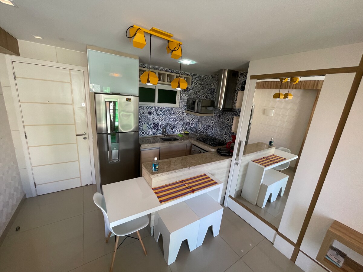 Piso completamente amueblado en la mejor ubicación de la playa de Ponta Negra, cerca de los mejores restaurantes y bares. Cocina completa con estufa, horno, microondas y refrigerador de bebidas. Aire acondicionado, televisión inteligente, cama de matrimonio, que es extremadamente cómodo. Baño con agua caliente, ducha escocesa, hidromasaje vertical y luz azul para relajarse. dos tablas de surf. Conserje las 24 horas y espacio de estacionamiento.