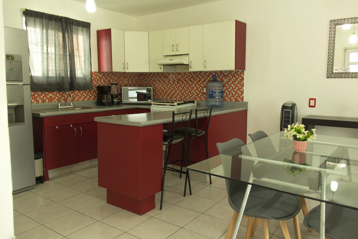 Este departamento, perfecto para 4 personas, se distingue por su hermosa luz natural que llena cada rincón y crea un ambiente cálido y relajante. Los espacios son cómodos, amplios y pensados para disfrutar en familia, pareja o amigos con dos habitaciones con aire acondicionado, camas matrimoniales y un sofá cama . Su excelente ubicación te mantiene cerca de todo, en una zona tranquila y segura ideal para descansar, trabajar o explorar Tuxtla.