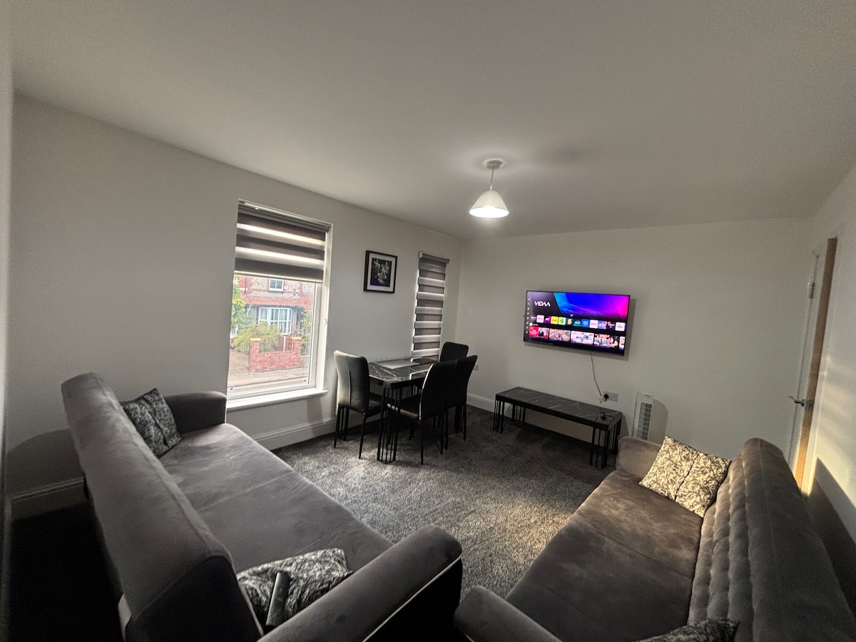 Este es un apartamento de un dormitorio, planta baja, recientemente reformado, con entrada privada y área de jardín trasero. El edificio está ubicado en el corazón de Cheadle. Muy cerca de tiendas, restaurantes, pubs y transporte público. A 10 minutos del aeropuerto de Manchester y a 20-25 minutos en coche del Manchester City. El departamento tiene 1 dormitorio recién decorado con una cómoda cama doble. La amplia sala de estar/cocina de planta abierta tiene un sofá cama - adecuado para 2 adultos, sin embargo, es una pequeña cama doble.