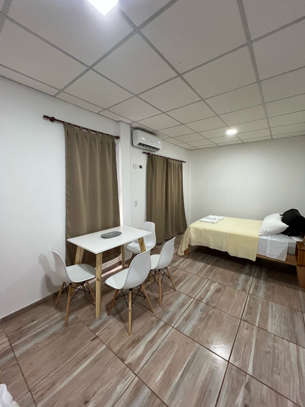 Alojamiento en el centro de la ciudad para hasta 4-5 personas. Wifi, Aire acondicionado, TV y cochera. 1 cama matrimonial y 3 camas de 1 plaza. Espacio para comer con microondas, frigobar, pava electrica y utensilios de cocina.