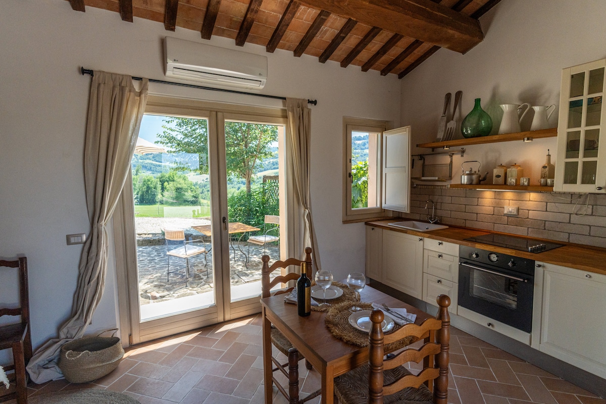 Independent Junior Suite in the hills of Le Marche, designed for guests seeking privacy, nature, and a slower pace, without giving up comfort and attention to detail A studio apartment with private entrance, kitchen, bathroom, and private garden. French-size canopy bed for an intimate and cosy stay Shared panoramic swimming pool (max 8 guests) and organic breakfast prepared fresh every morning included. Ideal for couples, friends or solo travellers looking for a peaceful countryside stay