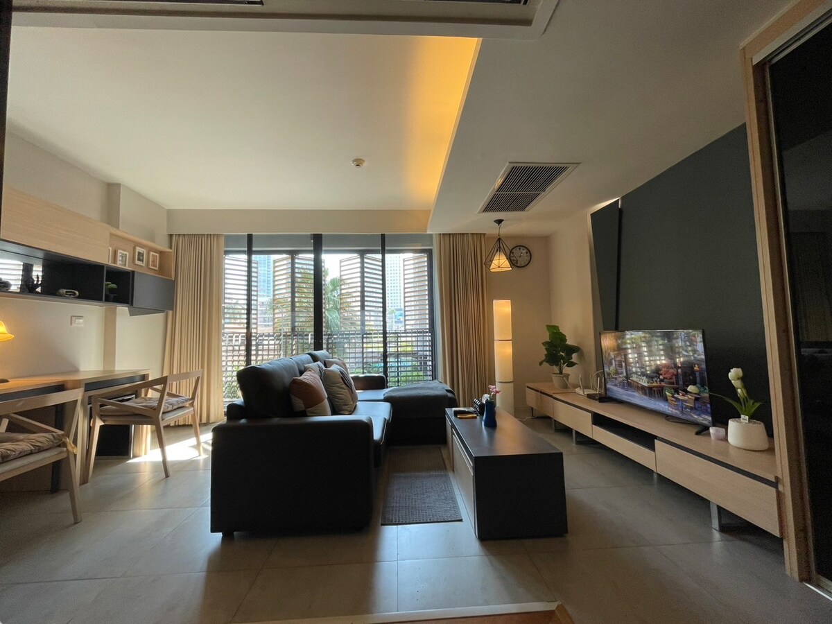 ¡Alójate en tu nuevo y espacioso condominio de lujo y meticulosamente decorado en el corazón de Bangkok! - Estancia de 1 mes optimizada para nómadas digitales. - Piscina infinita en la azotea, gimnasio, espacio de trabajo y mucho más. - Wifi rápido de 500 Mbps. La habitación incluye una cama tamaño queen, una acogedora sala de estar separada, una mesa de comedor/trabajo y todos los artículos de tocador esenciales. Equipado con una piscina infinita, un enorme gimnasio, sauna, simulador de golf y mucho más. Ubicado a 5 minutos a pie del MRT, varios centros comerciales y mercados nocturnos.