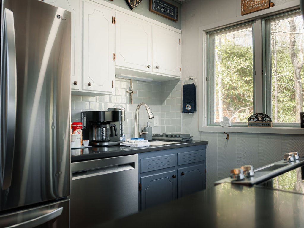 The Porch at Fairystone is your home away from home. This 1 bedroom 1 bathroom vacation home boasts a large open concept with the living area, kitchen and dining area all in one large room. Through a beautiful barn door you’ll find your bedroom and in-unit laundry closet with washer and dryer. Enjoy a beautiful outdoor dining space with chairs for 3 and a grill to cook your favorite meals. Just minutes away from Fairystone State Park, Goose Point, and Philpott Marina, Dam and Lake.