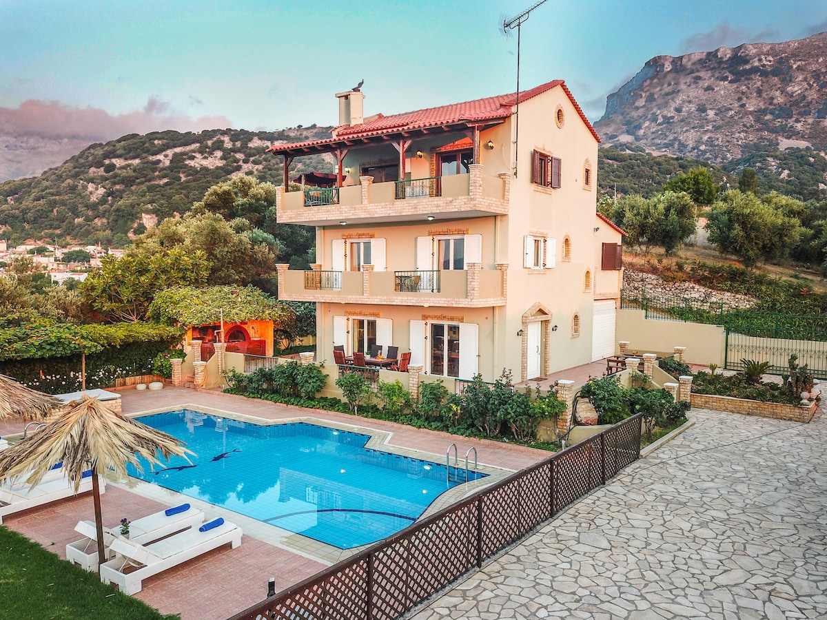 Relax under the bright Mediterranean sun, enjoy the magnificent Cretan landscape as well as a fantastic sea-view from this amazing villa, built at the foothill of mythical mount Ida amidst olive groves and sheep farms, in a quiet secluded village.
