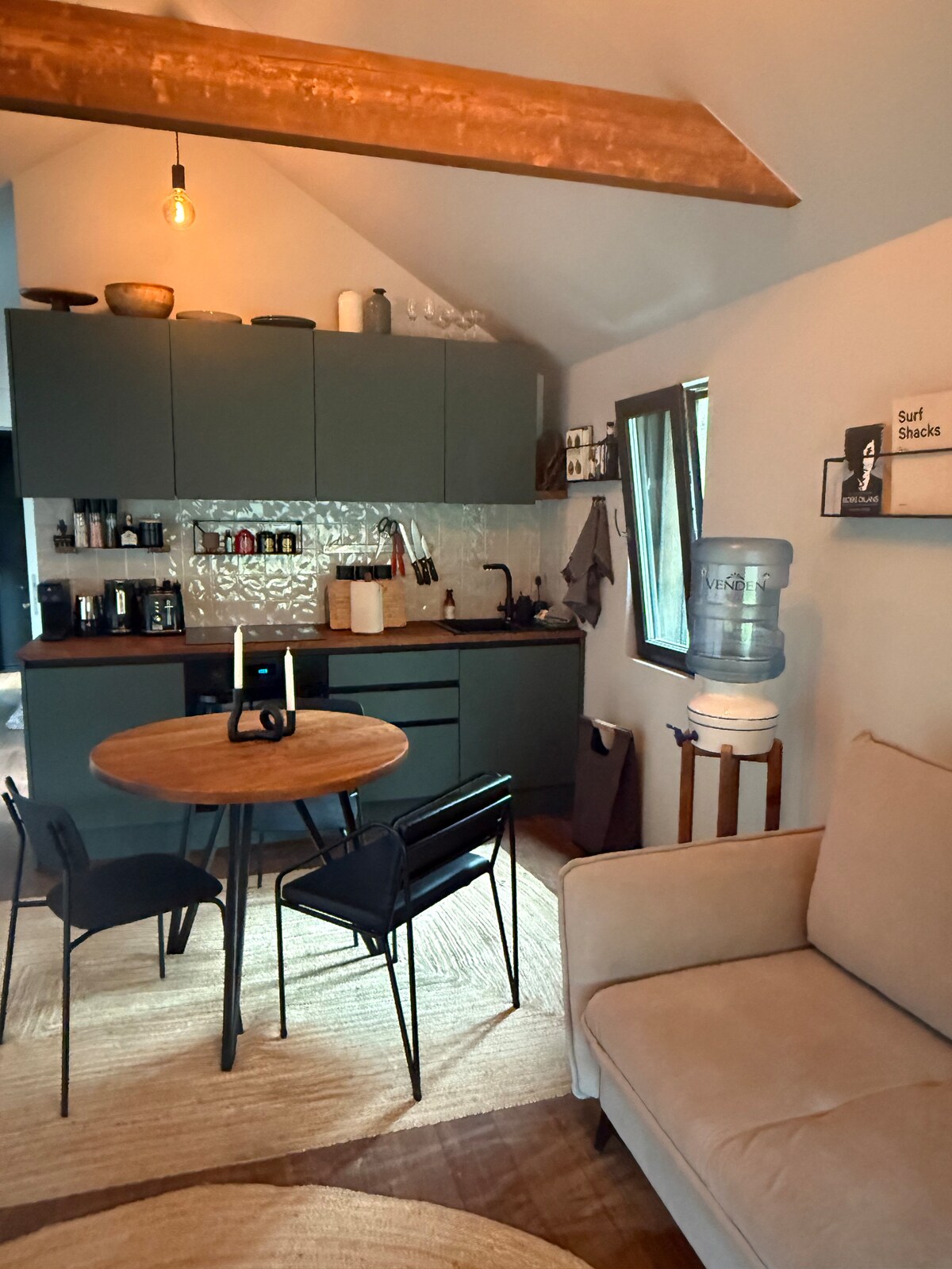 La casa tiene un gran estudio con una cama doble y una cama de arriba con colchón y almohadas. Hay un gran espacio habitable con tetera y microvave. Grandes ventanales con vistas al jardín. Muy familiar.