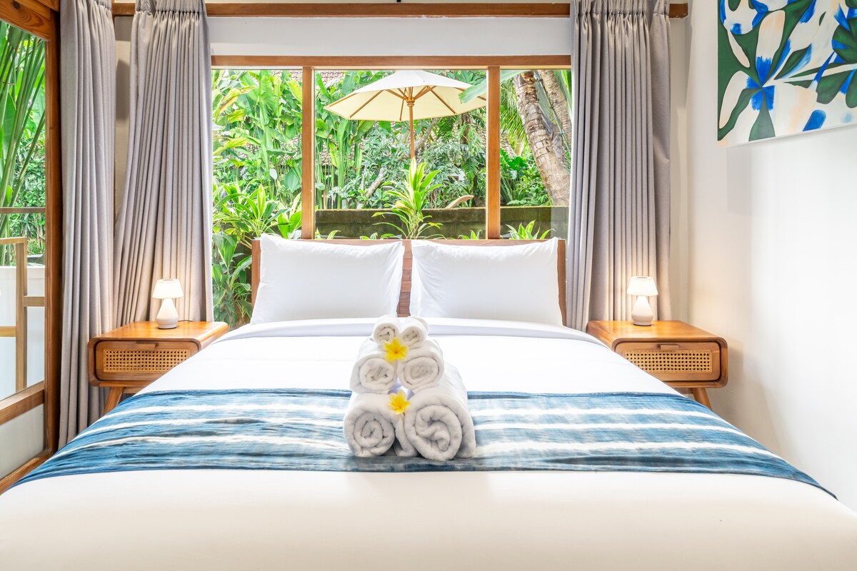 Tranquil 1BR hideaway in Ubud’s Penestanan / Sayan area: • 1 cozy air-conditioned bedroom with garden views • Bathroom with walk-in shower + amenities • Private patio with seating — perfect for morning coffee • Lush tropical garden setting • 2 swimming pools (shared) for sun time & relaxing dips • Daily cleaning with fresh towels & linens • Calm, green surroundings — made for rest and reset • 150 Mbps Wi-Fi • PS5, baby amenities on request • Concierge service for tours, spa & more