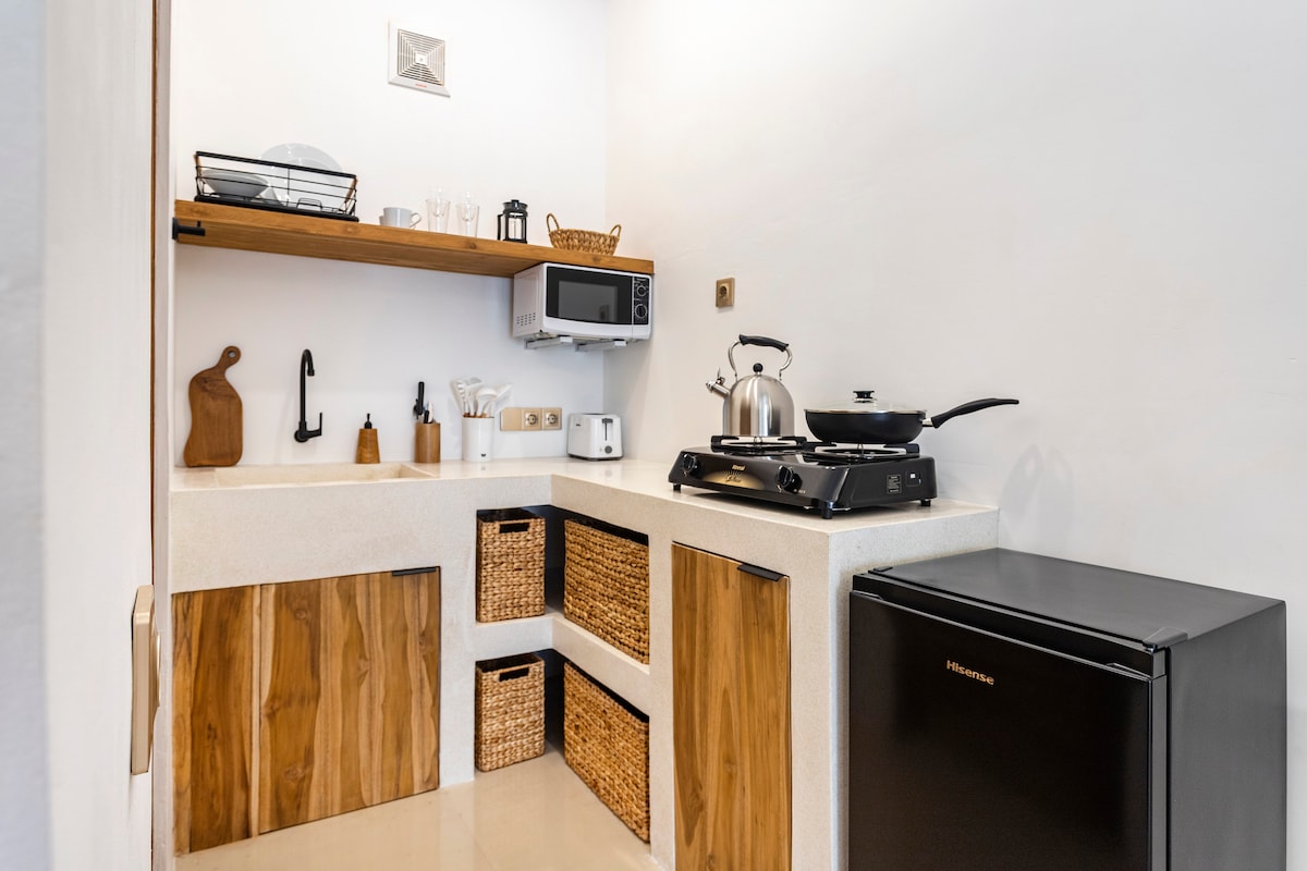 This spacious private suite in Ubud offers a a peaceful retreat and independent stay with a cozy bedroom, full kitchen, and separate living area. Ideal for couples, solo travelers, and digital nomads who value privacy, space, and a peaceful environment. Enjoy calming green views, a relaxed atmosphere, and access to a shared swimming pool within a quiet residential complex. With fully private guest areas, the suite is well suited for short stays, long stays, and remote work while exploring Ubud.