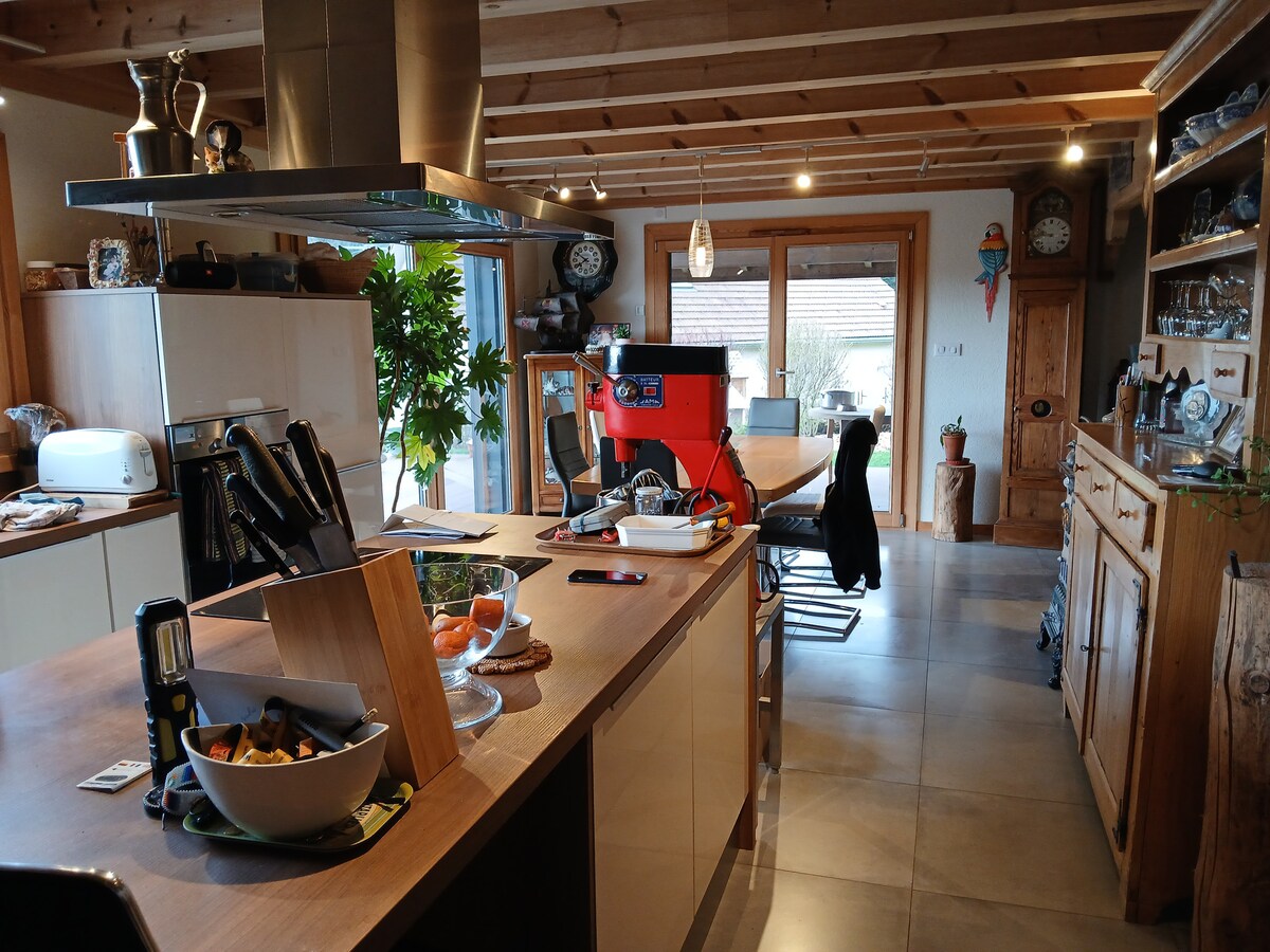 Nuestra familia te da la bienvenida a nuestro chalé. El alojamiento completo se encuentra en la planta baja. El chalet está en un callejón sin salida: mínimo tráfico y máxima tranquilidad. El alojamiento es cálido y está equipado con sauna. La casa está situada en el pueblo de Gras a 2-3 minutos a pie de un supermercado. Ubicación ideal para recorrer la zona. Salida de excursiones desde el pueblo. Pistas de esquí de fondo y circuito de raquetas de nieve. BTT. GTJ. Muy cerca de Suiza.