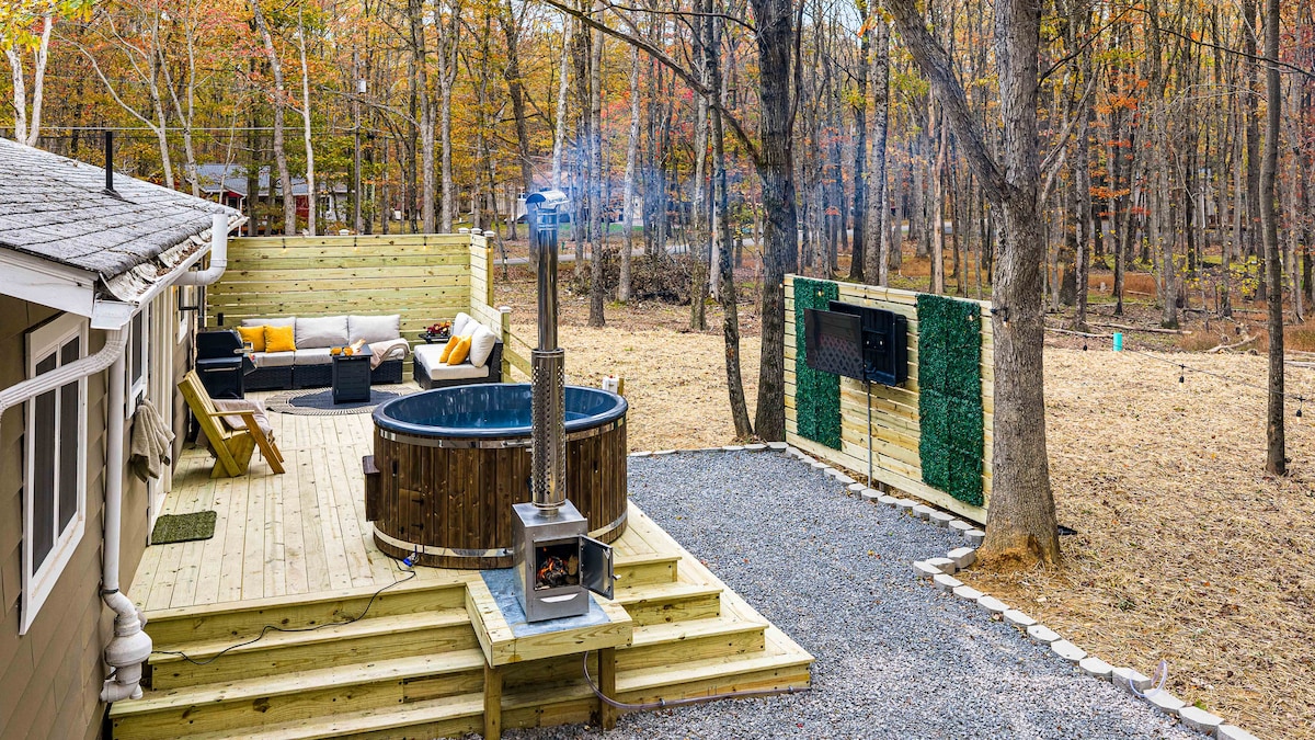 ¡Bienvenido a la mejor cabaña de las Pocono! La cabaña está bien cuidada y actualizada con buen gusto, ubicada en un gran y tranquilo terreno arbolado. Excelente ubicación con muchas atracciones cerca: lagos, playas, estaciones de esquí (Jack Frost, Big Boulder, Blue Mountain), golf, senderismo, rafting en aguas bravas, ciclismo, el centro de Jim Thorpe, paintball, parques acuáticos cubiertos y mucho más. La cabaña cuenta con una sala de juegos, cocina totalmente equipada, gran patio trasero privado con un jardín zen japonés, parrilla de gas y un pozo de fuego.