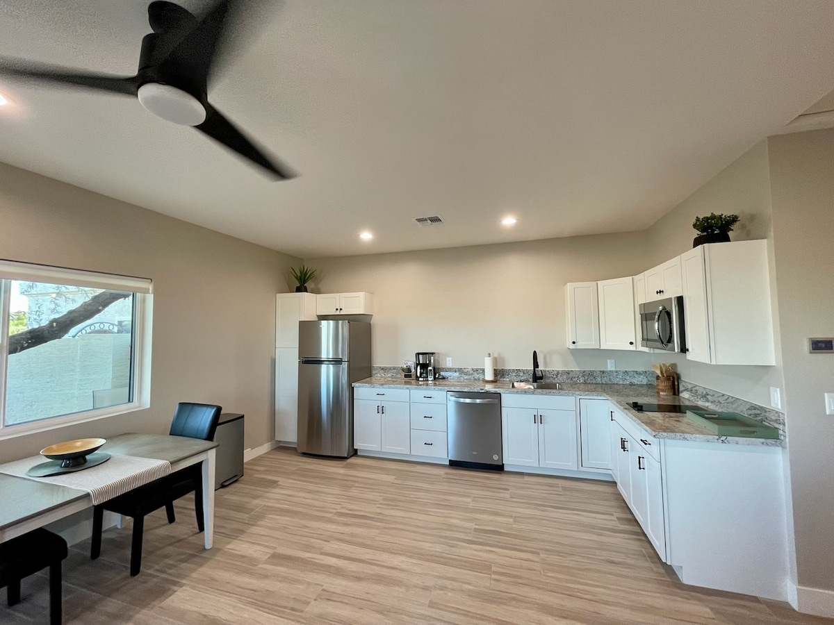 Esta casa de huéspedes está adjunta a la casa principal pero no se comunican y tiene su propia entrada privada. No hay espacios compartidos. Bonito, moderno/nuevo televisor de 55 pulgadas con canales y Netflix gratuitos. La estación de café es generosa con diferentes sabores de Keurig y cremas, así como algunos refrigerios diferentes para que disfrutes. Cocina totalmente equipada, refrescos disponibles en la nevera. Disfruta tu estancia
