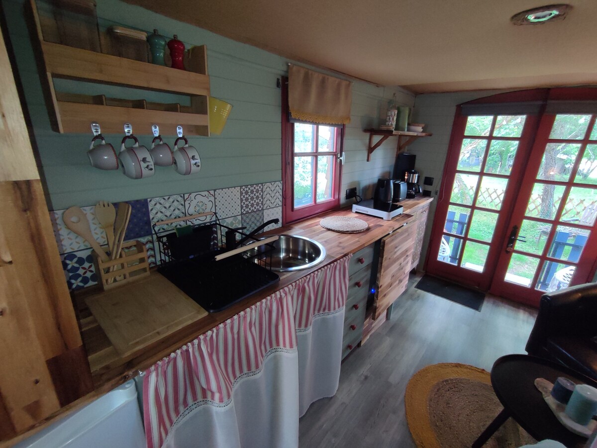 En el corazón del Périgord Blanc, a 10 minutos de Périgueux, capital de la Dordoña. Ubicada en un terreno cerrado y arbolado ,sin vecinos en un entorno campestre y relajante ,venga a alojarse en una caravana con todas las comodidades y llena de encanto.Totalmente equipada ,tiene una zona de dormitorio con armarios (ropa de cama incluida) Un cuarto de baño con ducha y lavabo. Una cocina americana muy funcional. Inodoros secos en el exterior, así como un jacuzzi (según la temporada)y varios espacios dedicados a la relajación.