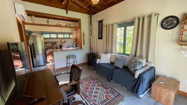 Una cabaña con estilo en un pueblo de cabañas, perfecta para una experiencia inolvidable. Ubicado a 6 km del centro de la ciudad, fue diseñado para proporcionar una estancia romántica y acogedora para parejas. Utiliza la minicocina con freidora de aire y placa de inducción. Relájate y crea momentos únicos junto al fuego del piso o con el proyector que convierte la habitación en una sala de cine y recibe la visita de los gatos que viven sueltos. También disfruta de la bañera al aire libre con solo agua fría y la parrilla. cámara en el área exterior.