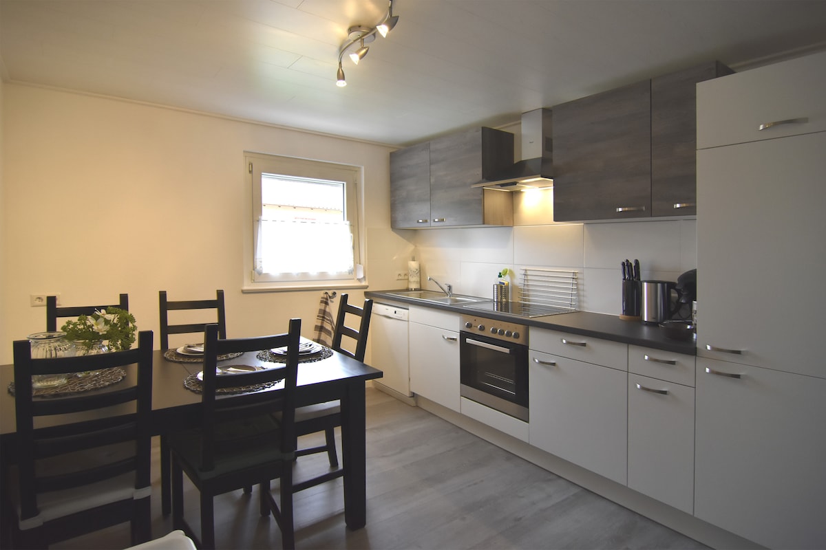 Unsere 65qm Maisonette wurde 2017 vollständig renoviert. Die moderne, vollausgestattete 3-Zimmer-Wohnung bietet Platz für 4 Personen und ist sowohl für Familien als auch Geschäftsreisende perfekt geeignet. Zur Wohnung gehören eine sonnige Terrasse und ein Stellplatz. Bäcker, Metzger und Bushaltestelle sind weniger als 100 m entfernt. Ins Zentrum sind es vier Stationen. Der DTV hat unsere Wohnung mit 4 Sternen (* * * *F) ausgezeichnet. Wir heißen euch herzlich willkommen. Karin und Thomas
