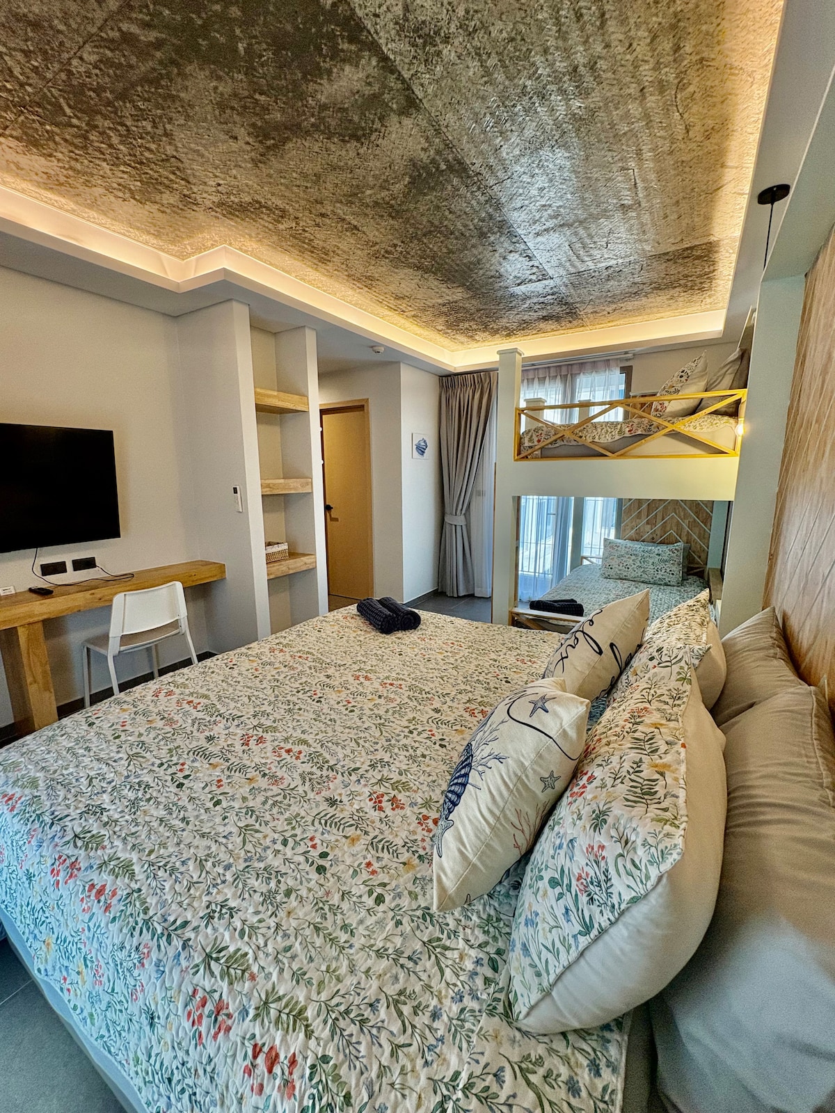 Our Family Room with Bunk Bed at Ozonicia is ideal for families, accommodating up to four guests. The room features one king-size bed for adults and a bunk bed for children or additional guests. It includes a private bathroom, comfortable bedding, and a work desk, offering a practical and cozy space. Guests also enjoy access to a shared kitchen with a stove, refrigerator, air fryer, microwave, blender, and dining table—perfect for a comfortable stay in Mai Khao, Phuket.