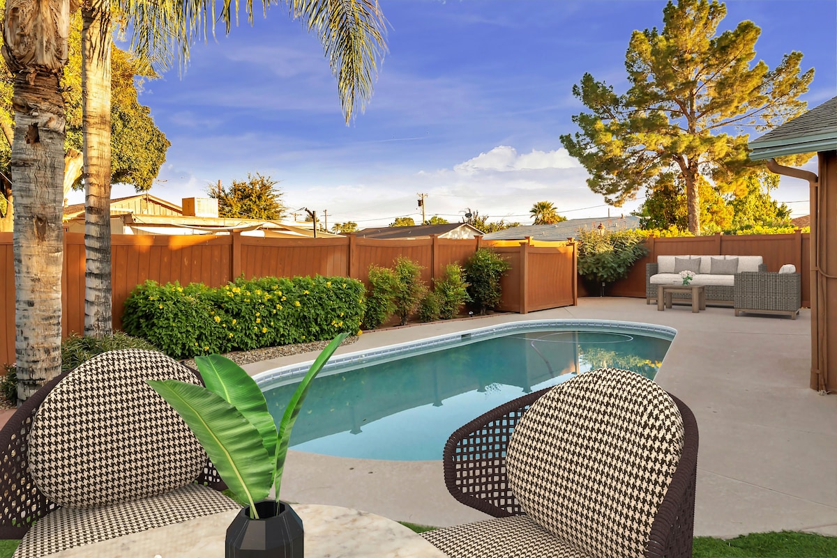 ¡Esta casa de 3 dormitorios y 2 baños recientemente renovada es ideal para familias, socios comerciales o amigos! Capacidad para 9 adultos. - Piscina de voleibol (opcionalmente climatizada) - Jacuzzi para 9 personas. - Sauna/sala de yoga/entrenamiento - 6 televisores y cortinas opacas. ¡Cerca de todo! - A 1 milla de Arcadia. - A 2 millas del Parque Papago, Jardín Botánico del Desierto, Agujero en la Roca. - A 3 millas del casco antiguo de Scottsdale (tiendas y restaurantes). - A 5 millas de ASU/Tempe. - A 8 millas del centro de Phoenix. TPT Tax ID: 21605544 Licencia para alquileres de corta duración: 2025-STR-002244