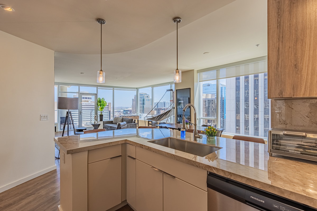 Tu espacioso apartamento de dos dormitorios cuenta con una cama tamaño king, un segundo dormitorio versátil y cocina totalmente equipada. ¡Disfruta de televisores de alta definición en todas las habitaciones y wifi incluido! Cerca de Roosevelt Row y a 10 minutos del aeropuerto Sky Harbor. ¡🌵 Experimenta la emoción urbana y la comodidad de estilo resort en AVE Phoenix Terra, con nuestro equipo de servicio dedicado disponible los 7 días de la semana🏆! Relájate en nuestra piscina en la azotea con vistas panorámicas, trabaja de forma remota en nuestro centro de negocios o mantente activo en nuestro gimnasio las 24 horas, los 7 días de la semana.