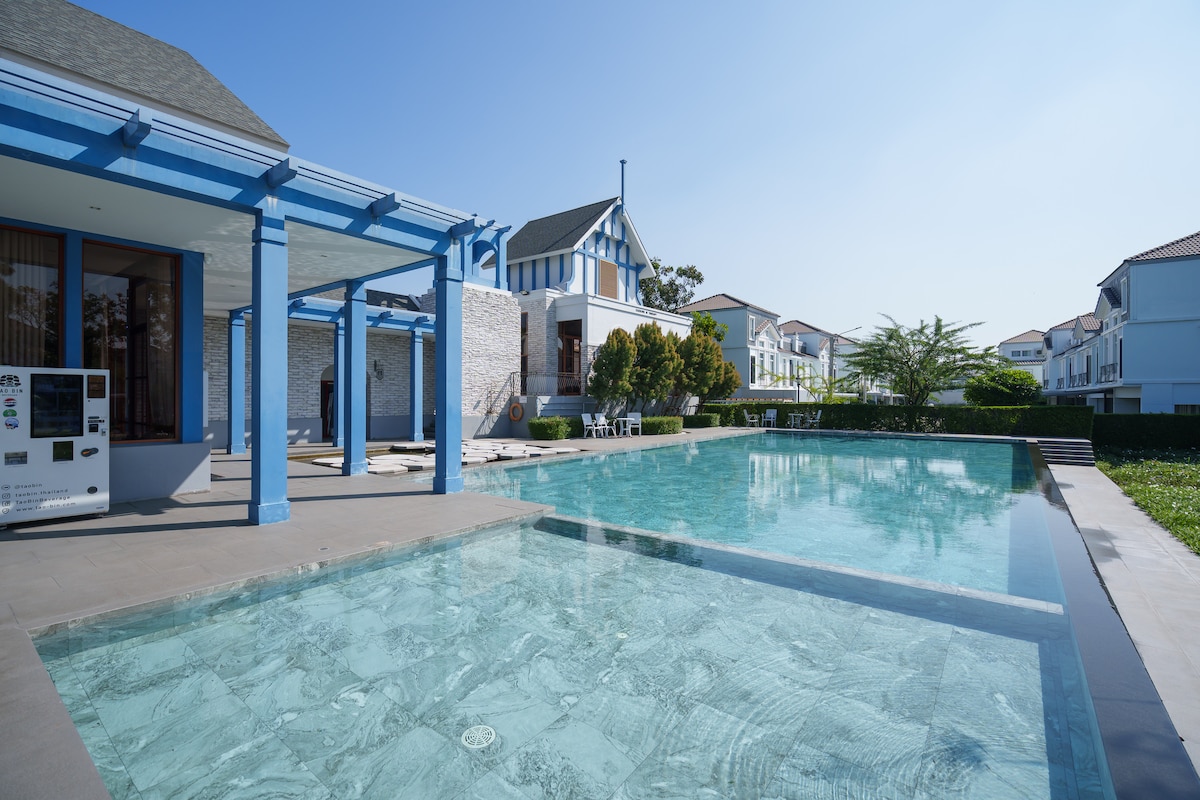 Alójate en nuestra casa de 3 dormitorios en Bang Na, en una tranquila comunidad cerrada. Las características incluyen una piscina, aparcamiento y espacios de estar totalmente equipados. A solo 15-20 minutos del aeropuerto de Suvarnabhumi, a 10 minutos de Mega Bangna y a 20 minutos de Udom Suk BTS. Ideal para familias o grupos que buscan comodidad, conveniencia y una base tranquila cerca de tiendas, restaurantes y atracciones de Bangkok.
