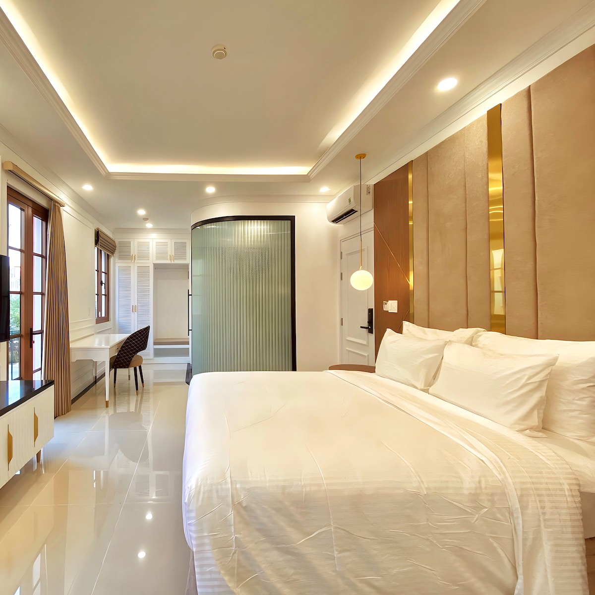 Experience Modern Luxury in the Heart of Sunset Town. Our spacious 35sqm Deluxe Room is meticulously designed with a "Minimalist Luxury" aesthetic, offering a 4-star standard stay. Nestled in the center of the vibrant Sunset Town (Thị trấn Hoàng Hôn), you are just steps away from the iconic Kiss Bridge and nightly fireworks displays. Whether you are here for a romantic getaway or a productive remote work trip, Leto Hotel provides the perfect sanctuary.