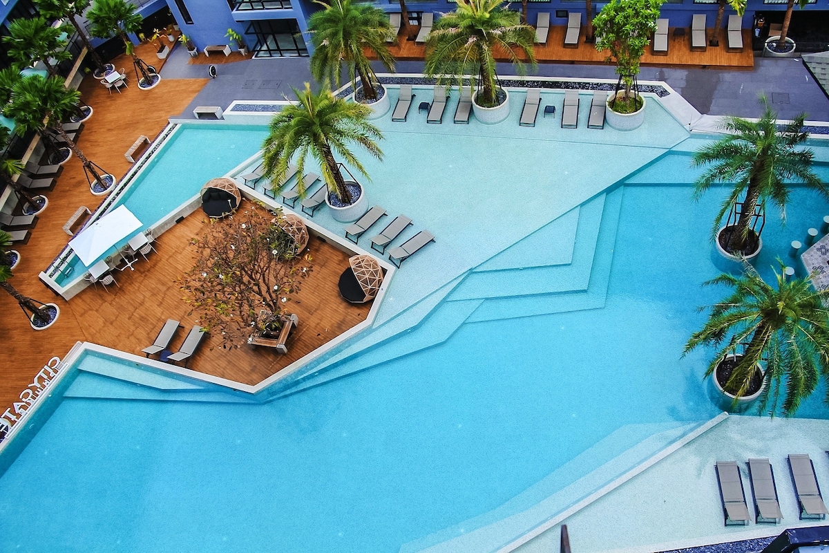 La mejor vista al atardecer al atardecer en la azotea, piscina y cocina, bañera, balcón, 1 dormitorio, 1 sala de estar, habitación acogedora y seguridad las 24 horas.