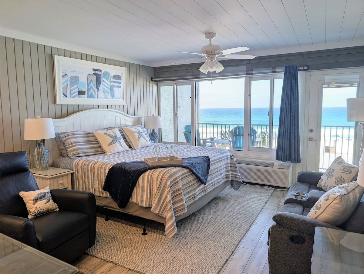 SILLAS DE PLAYA/SOMBRILLA GRATIS (del 15 de marzo al 31 de octubre de 2026). El complejo se renovó en marzo de 2026 y el estudio se remodeló en 2023. ¡Estamos ubicados DIRECTAMENTE en la playa en la hermosa PCB, con tu propio balcón privado! La habitación tiene una cama tamaño king, sofá de dos plazas, sillón reclinable y cocina completa y lavavajillas. El baño tiene una hermosa ducha a ras de suelo. A poca distancia de Pier Park y de muchos restaurantes. Nuevas instalaciones de lavandería con monedas o Visa 2024 en la propiedad. ¡Tenemos una cafetería junto a la playa y una piscina climatizada!