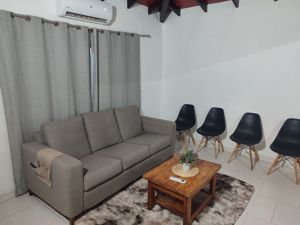 Monoambiente en el centro de Pilar, Ñeembucú cerca de todo, a 2 cuadras de la Plaza principal, el Cabildo, la Basílica y la Costanera. Cuenta con una cama de 1.60 metros en la habitación principal y un sofá cama para 2 personas en la sala, 2 aires de 12.000, 2 TV de 43" con Chromecast, Google TV HD y WIFI.