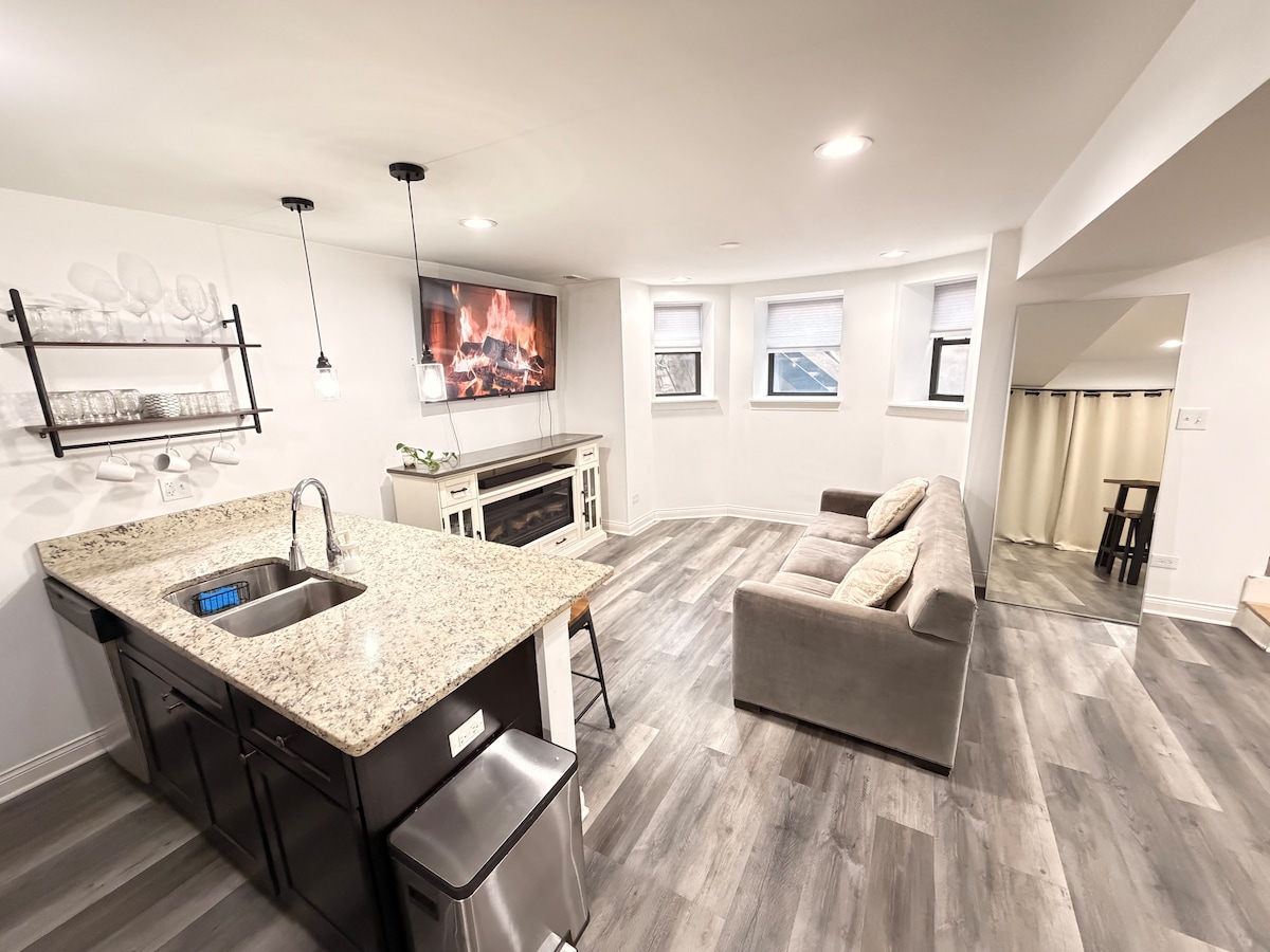 Apartamento totalmente equipado con jardín de 900 pies cuadrados en un edificio ocupado por el propietario. Entrada exterior privada con bloqueo inteligente. Plano de planta abierto con cocina grande. Eficiente en energía, muy limpio y excepcionalmente cómodo con calefacción por suelo radiante. Hay estacionamiento gratuito en la calle. Fácil acceso al monte. Sinaí (menos de 1/2 milla), el Distrito Médico de Illinois (2 millas) y McCormick Place (5 millas). Ideal para estudiantes de medicina.
