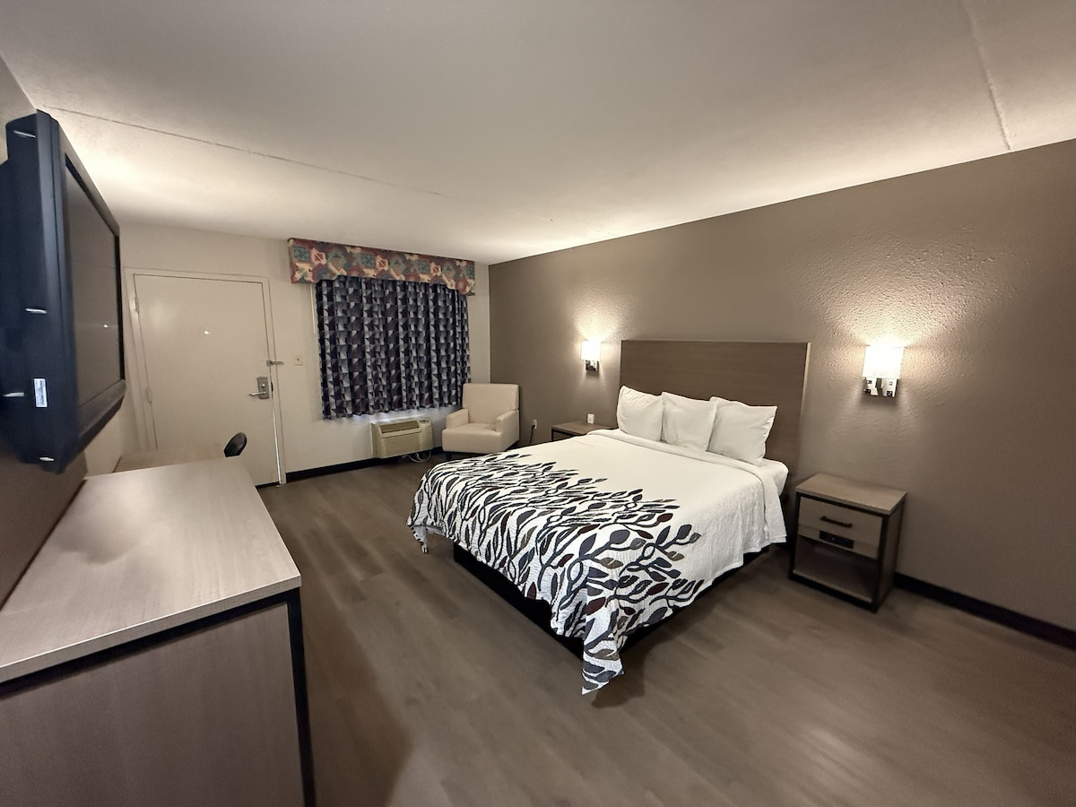 Acomódate y quédate un rato en esta habitación king limpia y económica, perfecta para equipos de trabajo, huéspedes a largo plazo o viajeros que pasan por Tucson. Convenientemente ubicada justo al lado de la I-10, nuestra propiedad hace que sea fácil moverse por la ciudad, ya sea que se dirija a sitios de trabajo, al centro de la ciudad o a restaurantes locales. Disfruta de una cómoda cama tamaño «king», wifi gratis, TV de pantalla plana y mininevera y microondas en la habitación: todo lo que necesitas para una estancia sencilla y sin estrés.