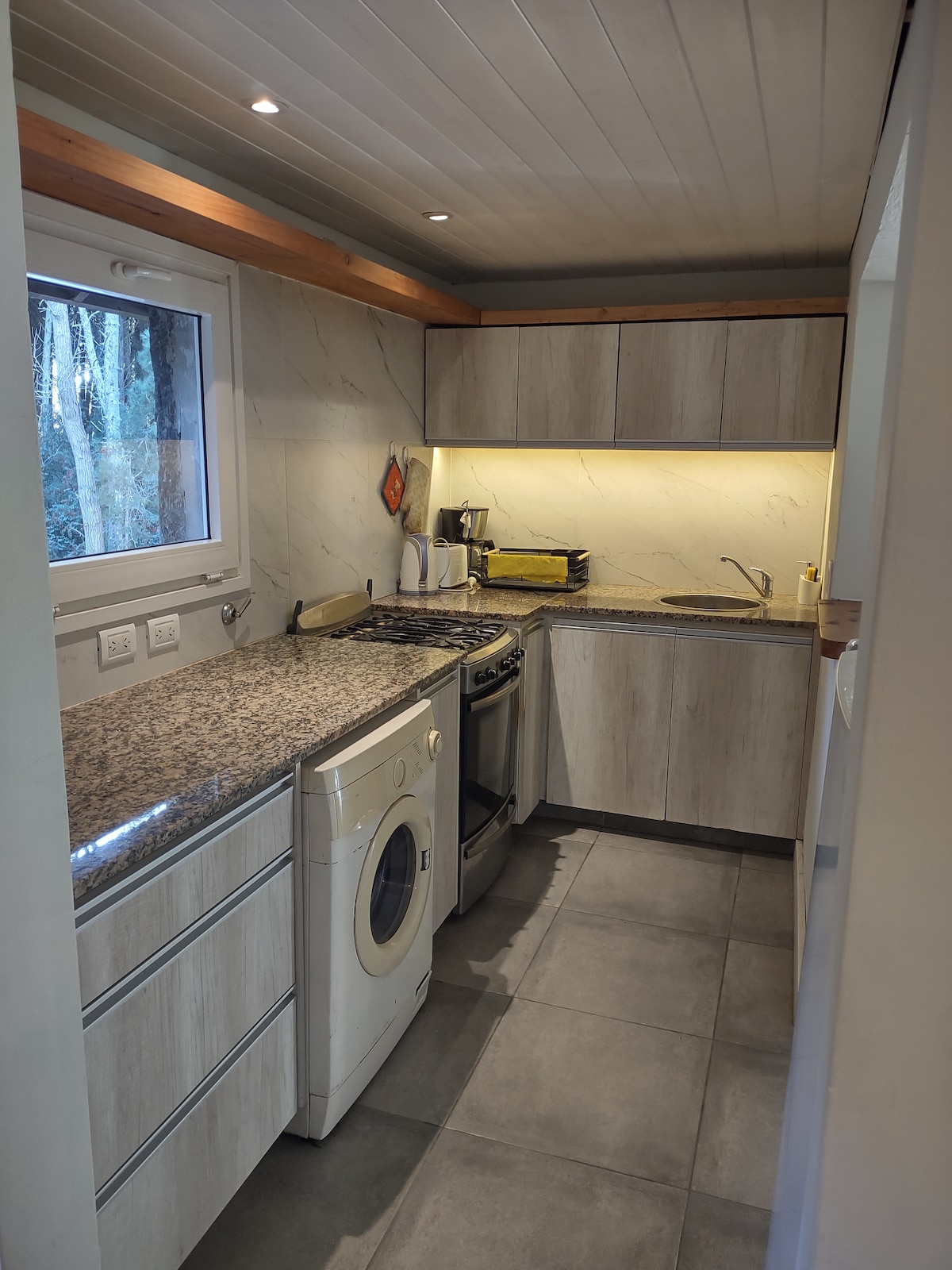 Ideal para descansar. Cabaña en el complejo Villa Alpina. Muy cerca de la playa y del centro comercial de Carilo. Estacionamiento. Dormitorio cama Queen + colchón + practicuna. Caja de seguridad. Sofá cama para 2 personas en living. Cocina completa con mesa. Heladera, microondas, cafetera. Balcón arbolado con parrilla. Baño completo. Wifi, 2 TV, Netflix. Club house pileta climatizada cubierta, jacuzzi, sauna, sala de lectura, vestuario, gym y juegos infantiles. Mayo: piscina cerrada del 3 al 22.