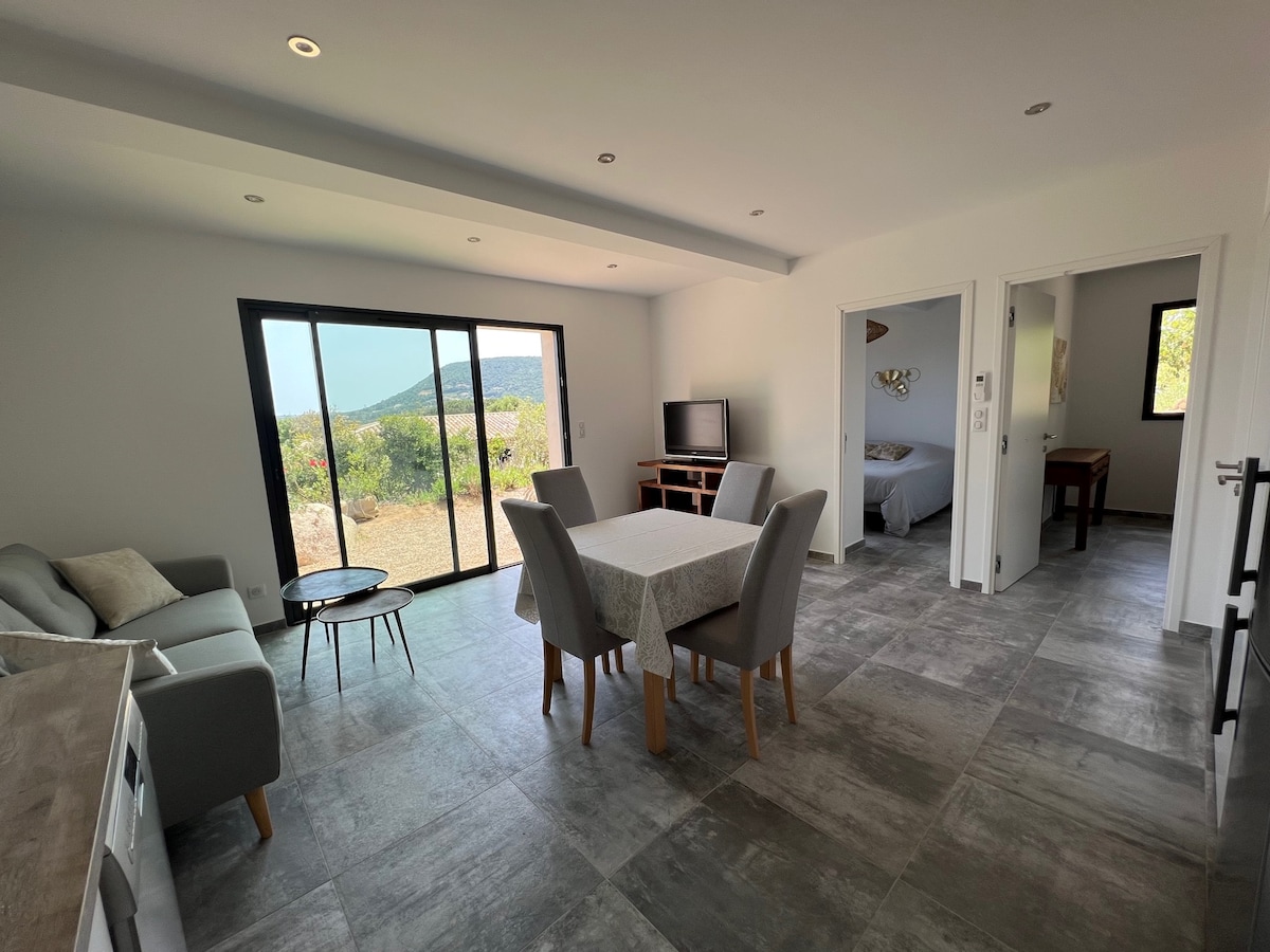 Cerca de Pinarellu y su playa. En una aldea de 3 casas muy tranquila: «Caseddu» de 50 m² nuevo con vistas a la montaña y acceso al mar playa de Caramontino. dormitorio con cama doble, 1 dormitorio con 2 camas individuales, baño con ducha a ras de suelo, aseo independiente. Cocina totalmente equipada en una gran sala de comedor y sala de estar. Terraza bajo pérgola, jardín independiente con plancha, ducha exterior, aparcamiento en la propiedad. Acceso al mar a 8 minutos a pie o 1 en coche.