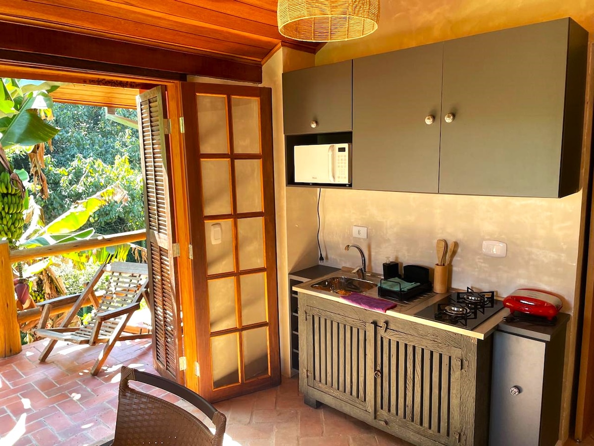 Hermosa cabaña, completa para hasta 2 huéspedes, 28 m², entrada independiente por el jardín, terraza con vista privilegiada al bosque nativo, bañera de hidromasaje doble moderna, despensa con fregadero, cocina, mesa y silla y utensilios básicos de cocina. Decoración con el tema "Naturaleza", cama queen size, 4 almohadas, ropa de cama y toallas, minibar, smart TV Samsung, chimenea eléctrica con efecto fuego, baño privado, espacio para colgar ropa y espejo de cuerpo entero.