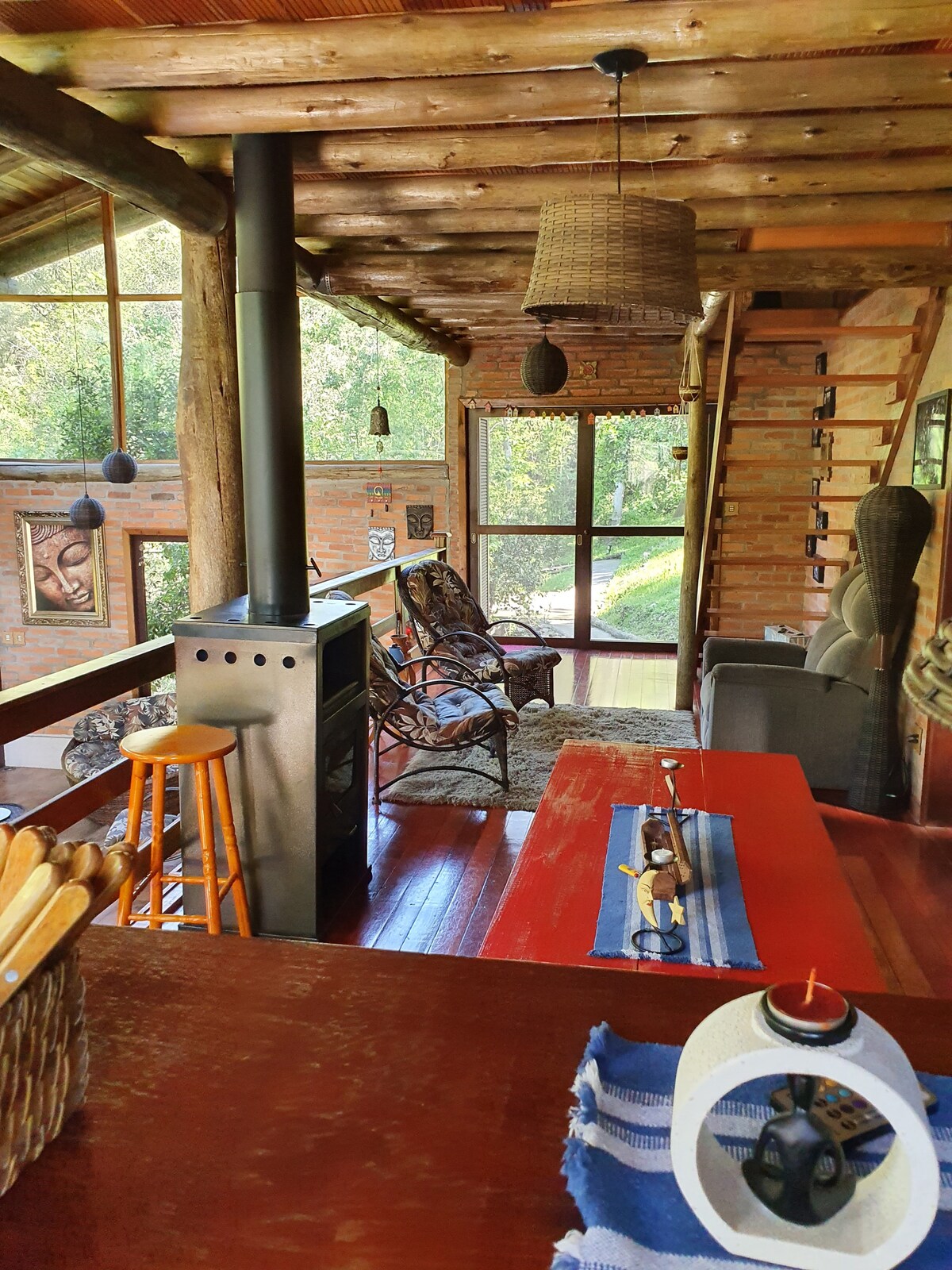 El lugar está a menos de 8 minutos en coche del Parque da Festa da Uva. Tiene un concepto abierto con 3 pisos, 1º piso: piscina con una pequeña sala, 2º piso: sala, cocina, baño, 3º piso: entrepiso con dos colchones y baño. La decoración es rústica y sencilla, pero acogedora, con excelentes lugares al aire libre. La terraza tiene vistas al arroyo que atraviesa el terreno, proporcionando un sonido relajante. La piscina está climatizada solo de octubre a marzo.