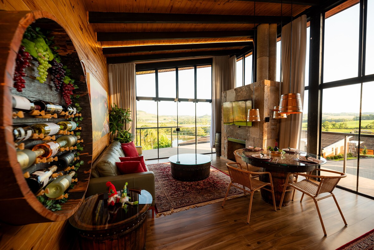¡Lugar increíble! Excelente lugar para descansar, desconectar de la vida urbana y conectar con la naturaleza. ¡Cerca del centro de Gramado, esta casa nos hace entrar en un mundo mágico en la granja! ¡Casa nueva, limpia, muebles de excelente gusto y la vista impresionante! ¡Romántico y muy silencioso! ¡Quien ve por las fotos no se imagina que todo es mucho más hermoso en persona! ¡Lo recomiendo mucho! (Palabras de la huésped Thaiani) Con 1 dormitorio doble, sala de estar/cocina integrada, baño, chimenea y balcón.