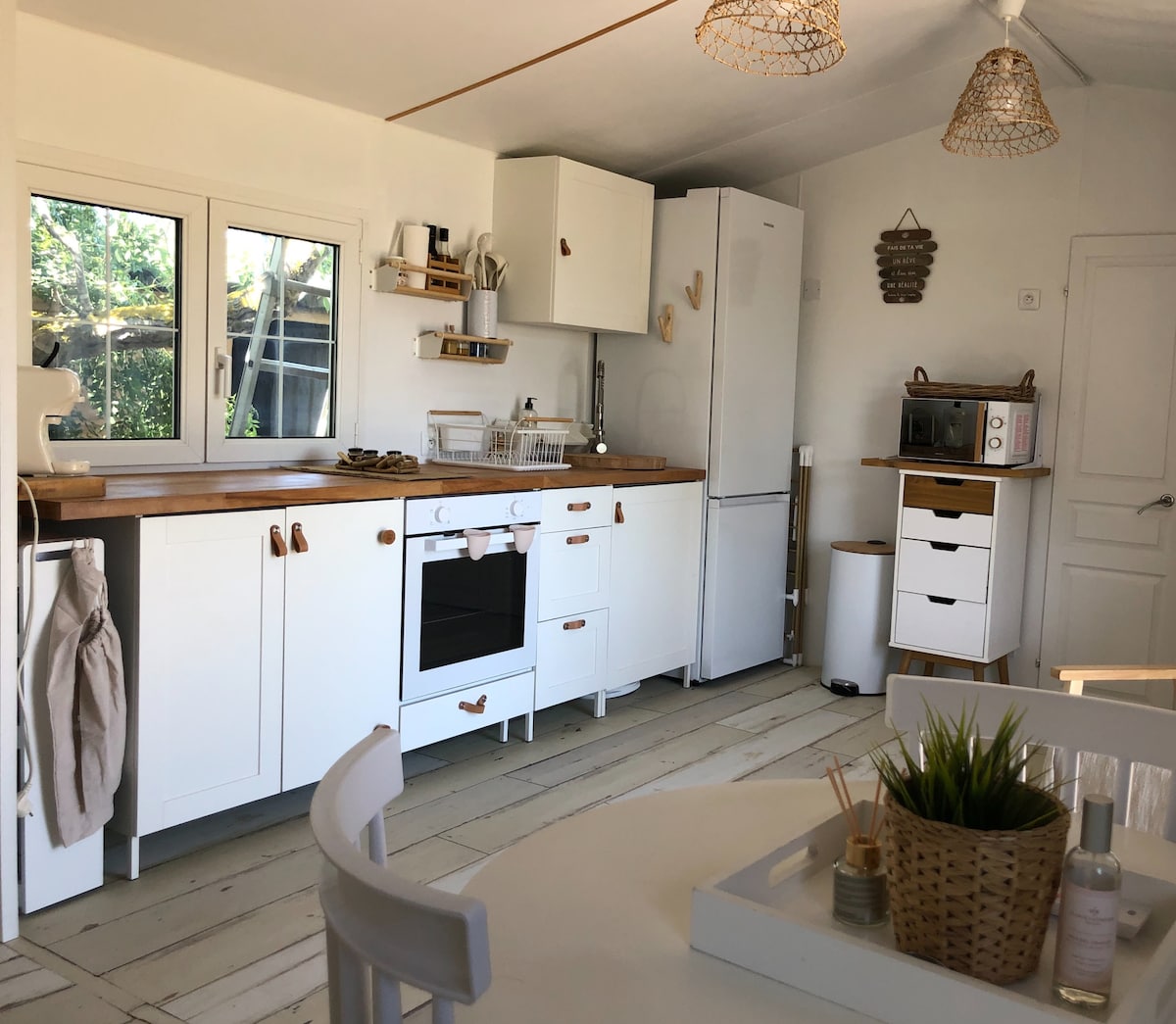 Cabane au sein d'un domaine arboré Mont St Clair, avec une terrasse vue sur la ville, le port et la mer à l'abri des regards en 2 espaces privatifs reliés par un escalier extérieur. Niveau inférieur fermé : Chambre 12m2 avec lit 160, toilettes Niveau supérieur : Salle d'eau douche, cuisine d'été de 6m2, ouverte sur une terrasse de 8 m2 avec table Buanderie commune avec lave linge et sèche linge Accès piscine collective ( non chauffée) de 09h à 19h. Parking gratuit côté chambre pour 1 véhicule