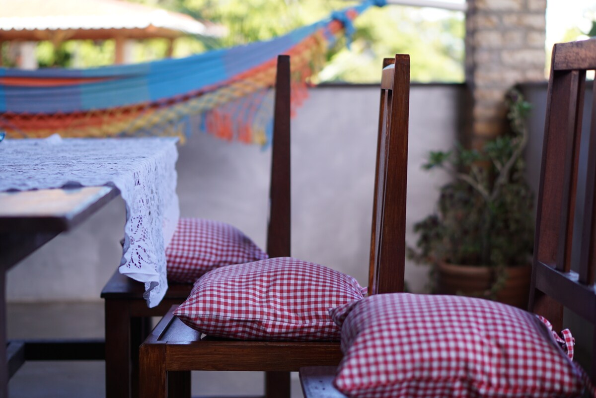 Acogedora, ventilada y muy luminosa, situada en "Villa La Ribera", un condominio de 3 casas con un amplio jardín lleno de paz y naturaleza. Cuenta con buen internet, silla de escritorio, balcon con mesa, sala de estar con sofá cama, cocina, 1 baño, 1 dormitorio con TV y aire acondicionado y mucho confort ❥ Se encuentra a: 200 metros de panadería 500 metros del principal supermercado 1km de la Playa do Amor y del centro Ideal para quienes buscan un lugar tranquilo, pero con fácil acceso a todo.