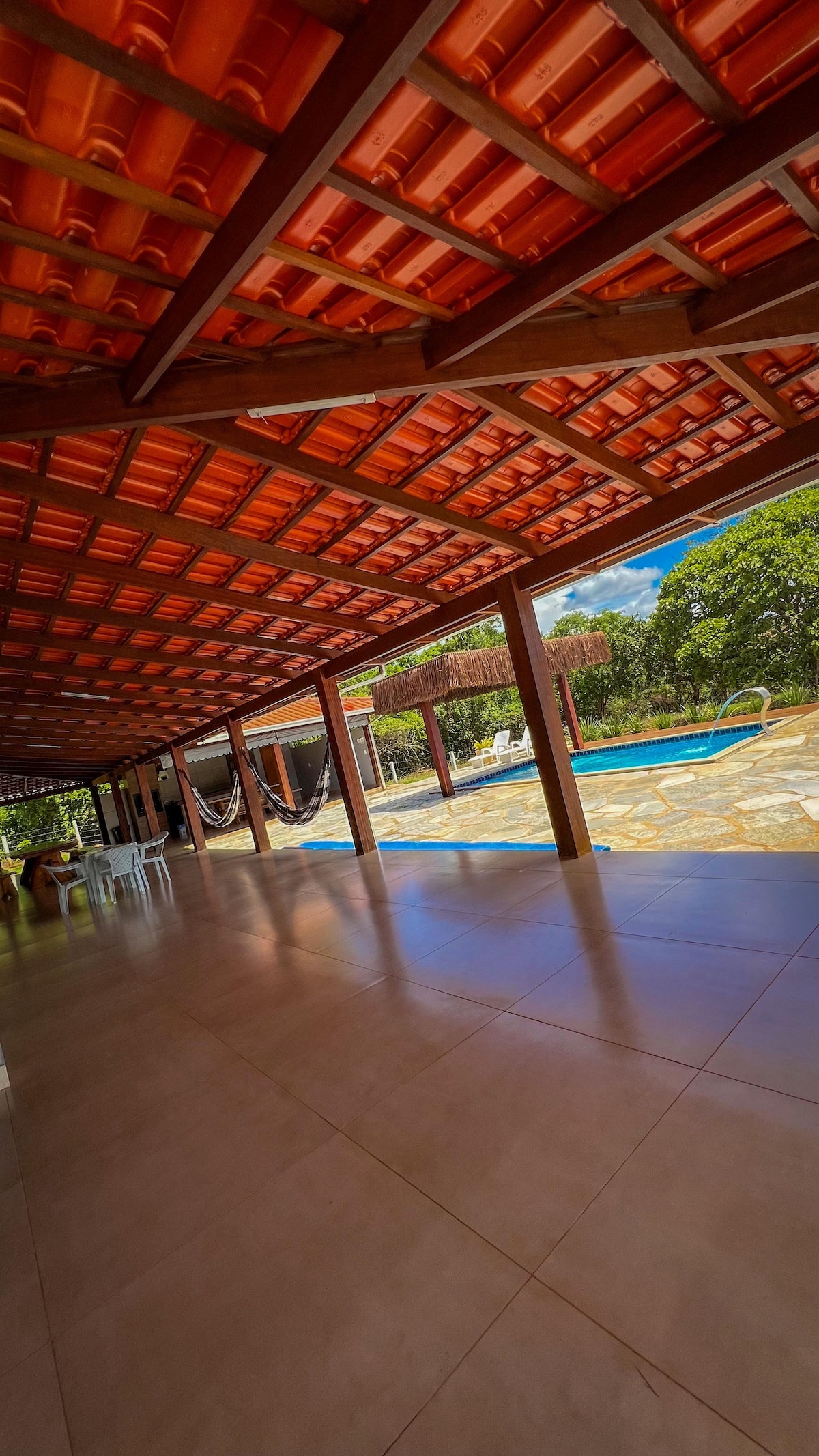 La granja Coqueirão se encuentra a 10 km del cruce de Pirenópolis (8,5 km de asfalto y 1,2 km de camino de tierra). SIGA POR WAZE o GOOGLE MAPS. Es un lugar muy arbolado, en medio de la naturaleza y muy acogedor. Amplio espacio de ocio, balcón con sala de estar, cocina completa, bodega, TV 42' con sky. Sauna de vapor, piscina con calefacción solar, barbacoa de carbón, chimenea exterior y campo de fútbol/voleibol/disco volador. El espacio es exclusivo para familias y tiene capacidad para 12 personas