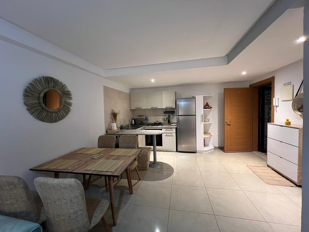 Situado en el barrio de Talborjt, cerca de todos los servicios: 2,6 km de la playa y la cornisa, a 1.8 km del gran mercado zoco EL-HAD Situado en la Planta baja. Lavadora, secadora. Acondicionador de aire/calefacción. 1 cama doble, 1 cama individual. 2 banquetas que se pueden utilizar como camas individuales . Cocina totalmente equipada, batería ... Internet de alta velocidad 20mbps para teletrabajo. TV vía satélite, canales de TV streaming, películas de series. Barrio residencial tranquilo . Estacionamiento gratuito