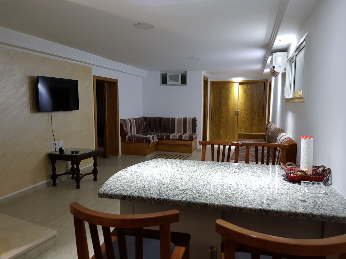 Relájese en este encantador piso de villa con aire acondicionado en medio sótano, que ofrece una hermosa terraza y un hermoso jardín común. Situado en una zona residencial tranquila, a solo 5 minutos en auto de la famosa playa de Kélibia y a 5 minutos del centro de la ciudad, con las inmediaciones de muchas cafeterías y restaurantes. Este alojamiento tiene una acogedora sala de estar, una cocina americana bien equipada, una agradable zona de comedor y una zona de dormitorio aislada que consta de dos dormitorios.