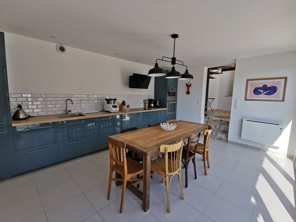Simplifíquese la vida en este alojamiento tranquilo y céntrico. Casa reformada con el espíritu de las Cícladas como un nido luminoso. Gran sala de estar de 30 m2 con salón comedor cocina que da a una terraza para comidas al sol. Una estufa completa esta habitación para calentar los pocos días de lluvia que nunca duran. Arriba, una pequeña escalera conduce a 2 dormitorios con un baño con ducha en el centro. 1 dormitorio principal con cama de 160 cm x 200 cm 1 habitación para niños 2 camas de 90 x 200. La serenidad.