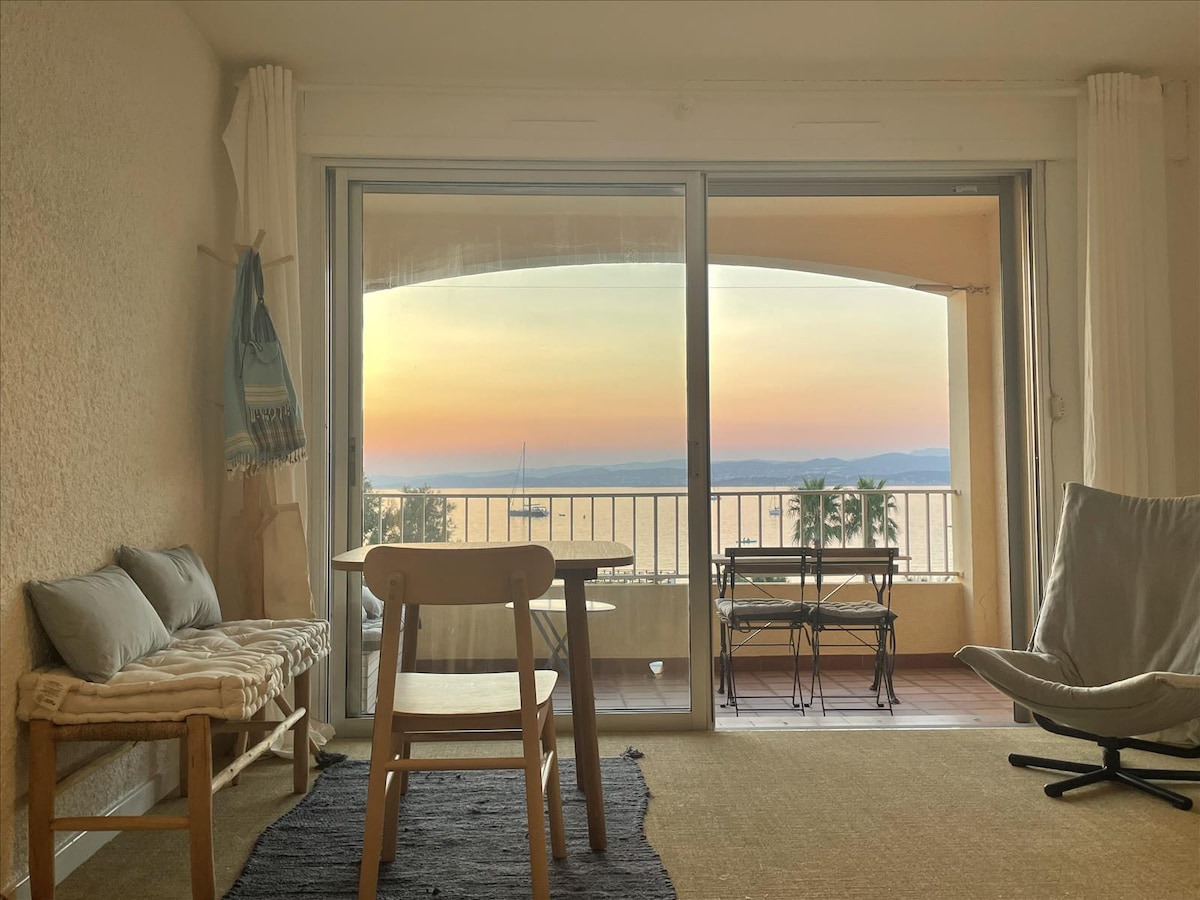 Frente a una playa de arena fina, apartamento completamente renovado (38 m²) con vistas al mar ¡Disfrutará de unas vistas impresionantes del mar y del archipiélago de Embiez con hermosas puestas de sol! Cómodo: aparcamiento privado, aire acondicionado, lavadora, lavavajillas... Sótano: guardar bicicleta, windsurf, paddle surf.... Todo a pie: tiendas, restaurantes, playas, paseos, embarcadero Iles des Embiez y alquiler de tablas de windsurf, kayaks, remos