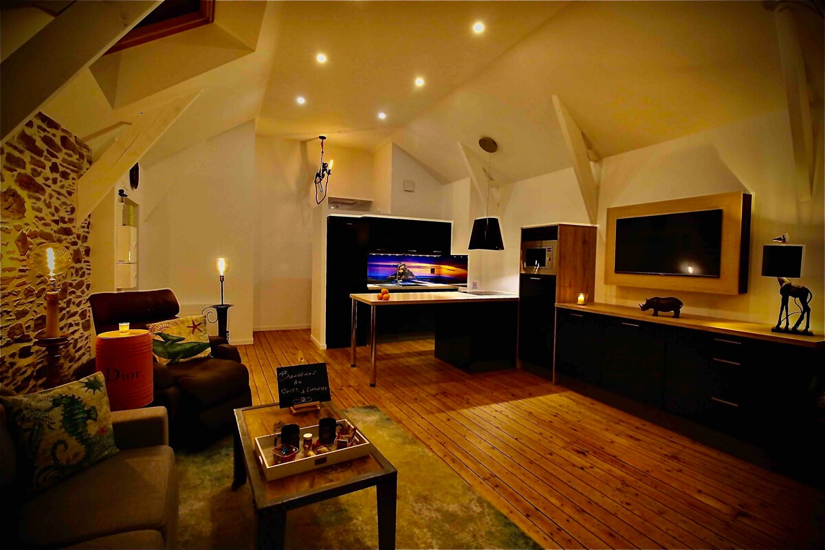 En pleno centro de Dinan, déjate llevar por la elegancia de la antigua Roma. Relájese en una suite de lujo con balneario privado 🛁. Disfruta de la comodidad de una cama queen size con ropa de cama de hotel 🛏️, una cocina equipada, una televisión conectada con Netflix, wifi de fibra y una terraza privada. A dos pasos de la Torre del Reloj y del pintoresco Jerzual. Aparcamientos, restaurantes y tiendas en las inmediaciones. Todo está preparado para una escapada romántica inolvidable ❤️.