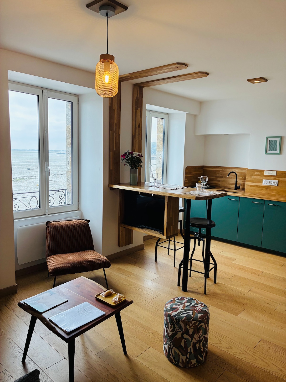 Despierta tus sentidos frente al Mont-Saint-Michel. Clasificado 3 estrellas y certificado Qualidog, este nido de una sola planta enclavado entre el mar y el campo ofrece impresionantes vistas de 180° de la bahía. En el interior: 2 acogedores dormitorios, cocina equipada, salón con estufa de leña y sofá cama. La terraza inunda el espacio de luz, el futbolín Bonzini y el jardín arbolado invitan a la relajación. Un refugio único, entre elegancia, serenidad y momentos inolvidables, todo ello accesible también para tu mascota.