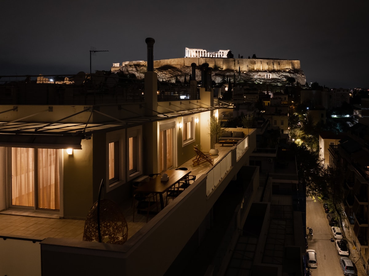Experience Acropolis view and luxury living in the heart of Athens, a residence where modern elegance meets HISTORY. Located NEXT to the Olympian Zeus Temple, this penthouse offers a MAGIC VIEW of the Acropolis & the Athenian Skyline. Just a 4 min. walk to the Acropolis Museum and 1km/0.6mile to the Acropolis, perfectly placed to explore Athens' most important landmarks. With 3 luxurious bedrooms,+1 SOFA BED+ !1EXTRA BED and a couch it comfortably accommodates up to 8 guests, ensuring comfort.