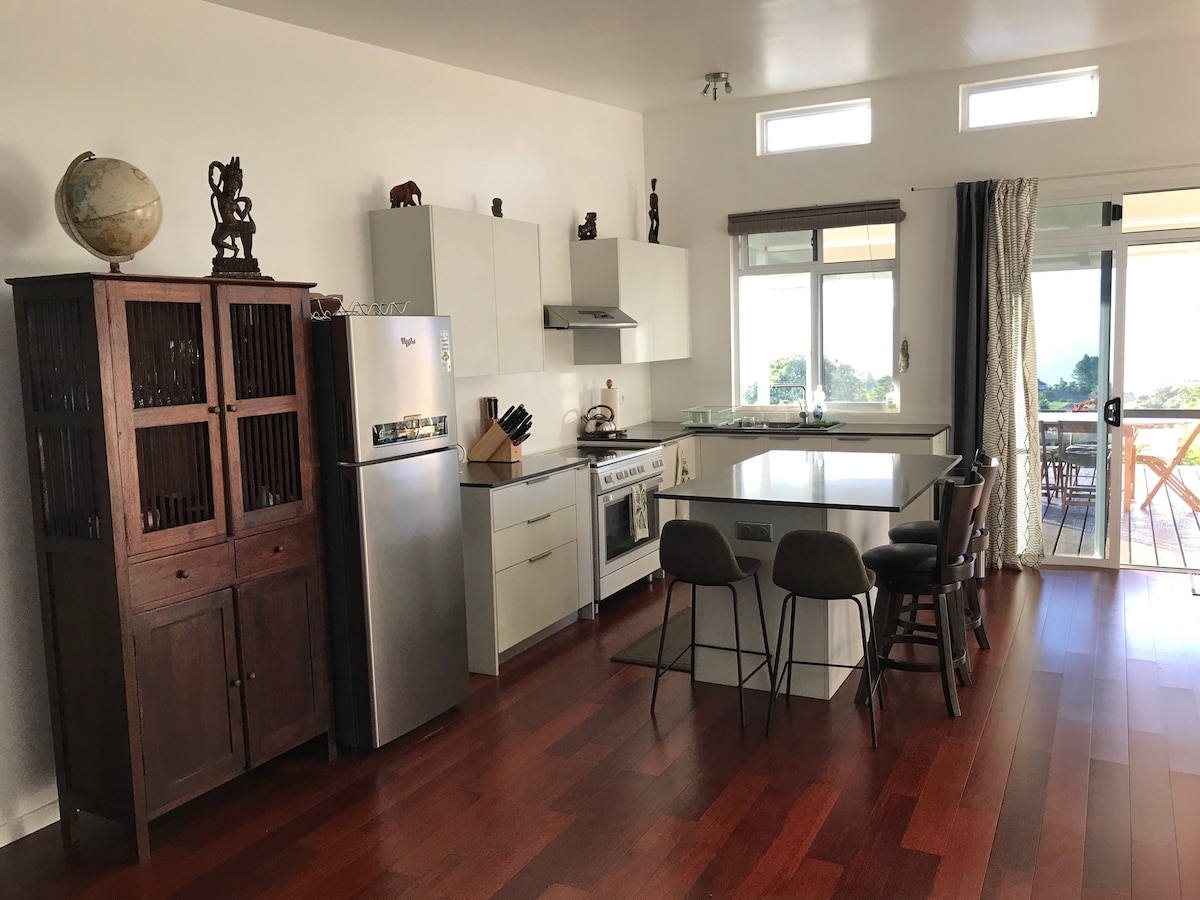 Perched at 1,500 ft (460 m) on Tahiti’s presqu’île, this private, very well equipped and comfortable home offers stunning views of the mountains, lagoon, and reef. Set on a 1,800 m² (19,375 sq ft) property for max privacy, it is very quiet and surrounded by nature. Just 4 minutes from the main road, enjoy cooler temperatures. Ideal for 2 couples with separate bedrooms and bathrooms, or families, or just couples seeking space and privacy. Beaches, shops and Teahupo’o are nearby. Car required.