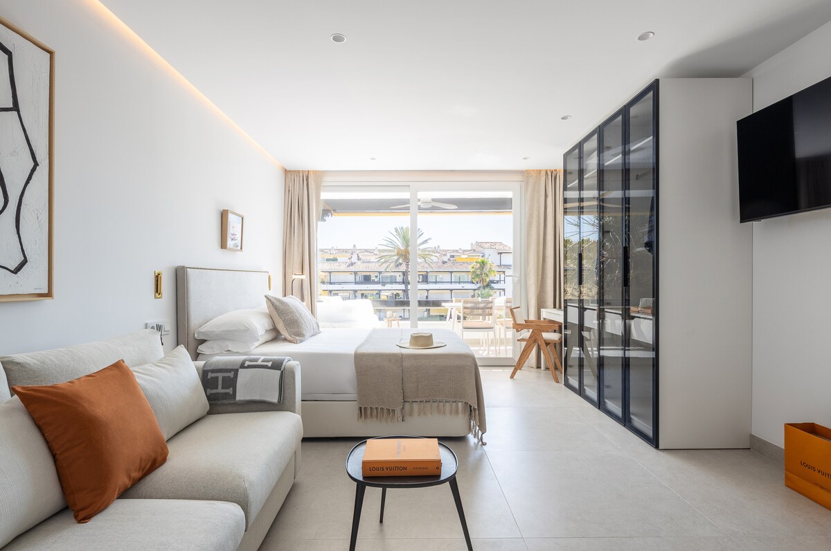 Suite de diseño en la Milla de Oro, a un paso del Marbella Club. Disfruta de tu Nespresso en la terraza con impresionantes vistas al mar, a solo 4 minutos a pie de la playa. ✦ Terraza con vistas al mar y montaña ✦ 2 piscinas estilo resort + Pista de tenis ✦ Parking privado gratis* + Seguridad nocturna ✦ Wifi Fibra 1 Gbps + Smart TV / Netflix ✦ Cama Queen + Aire Acondicionado. Ideal para parejas, profesionales en remoto y familias pequeñas que buscan estilo, tranquilidad y la mejor ubicación.
