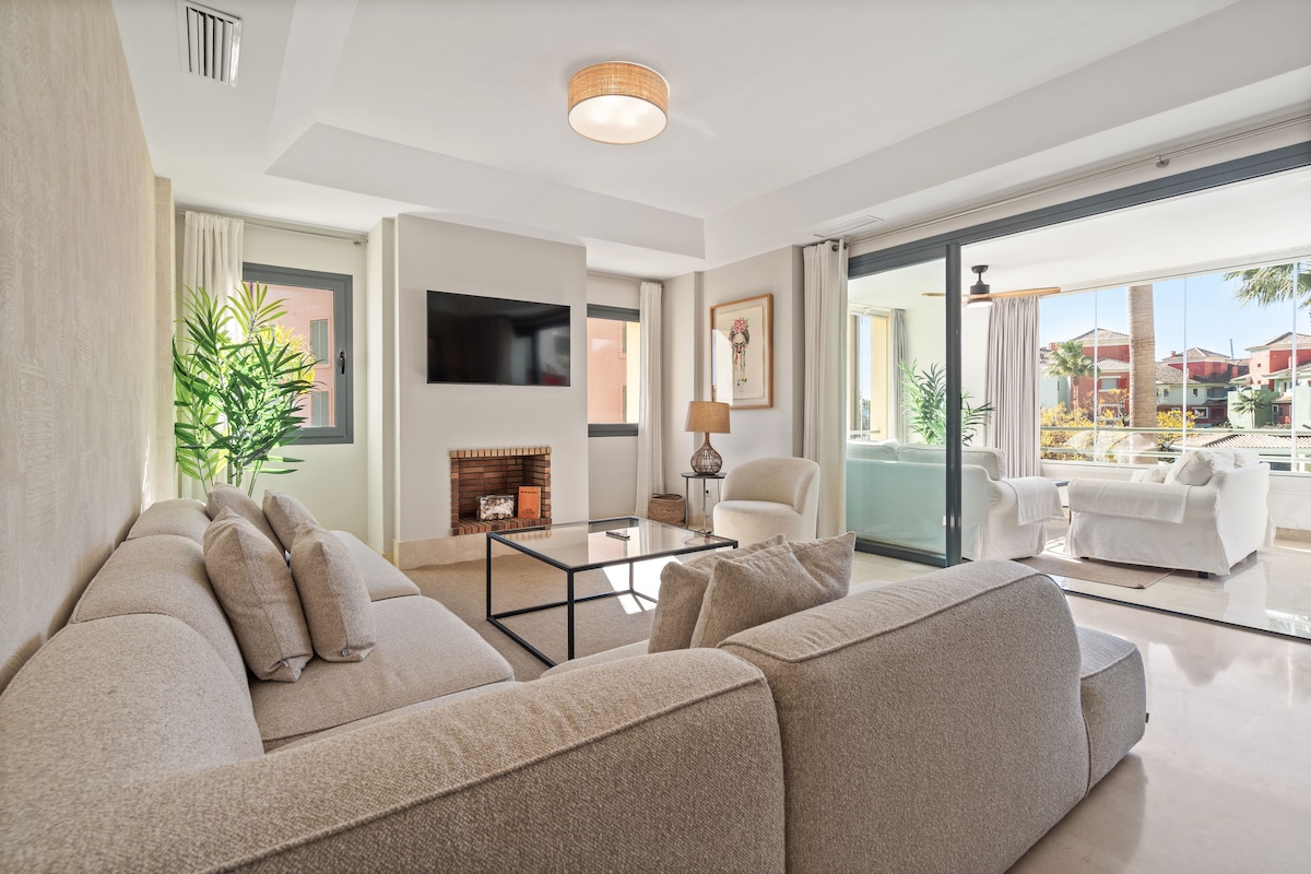 This spacious, fully renovated two-bedroom apartment is located in the Sotogrande Marina, a short walk from the beaches. The master bedroom has a king-size bed and an ensuite bathroom. The guest room offers twin beds and a private bathroom. Furnished with brand-new furniture, the apartment includes bed linens, towels, free Wi-Fi, and access to streaming services like Netflix. The living and dining area extends to a private terrace, complete with a television and fireplace for a cozy ambiance.