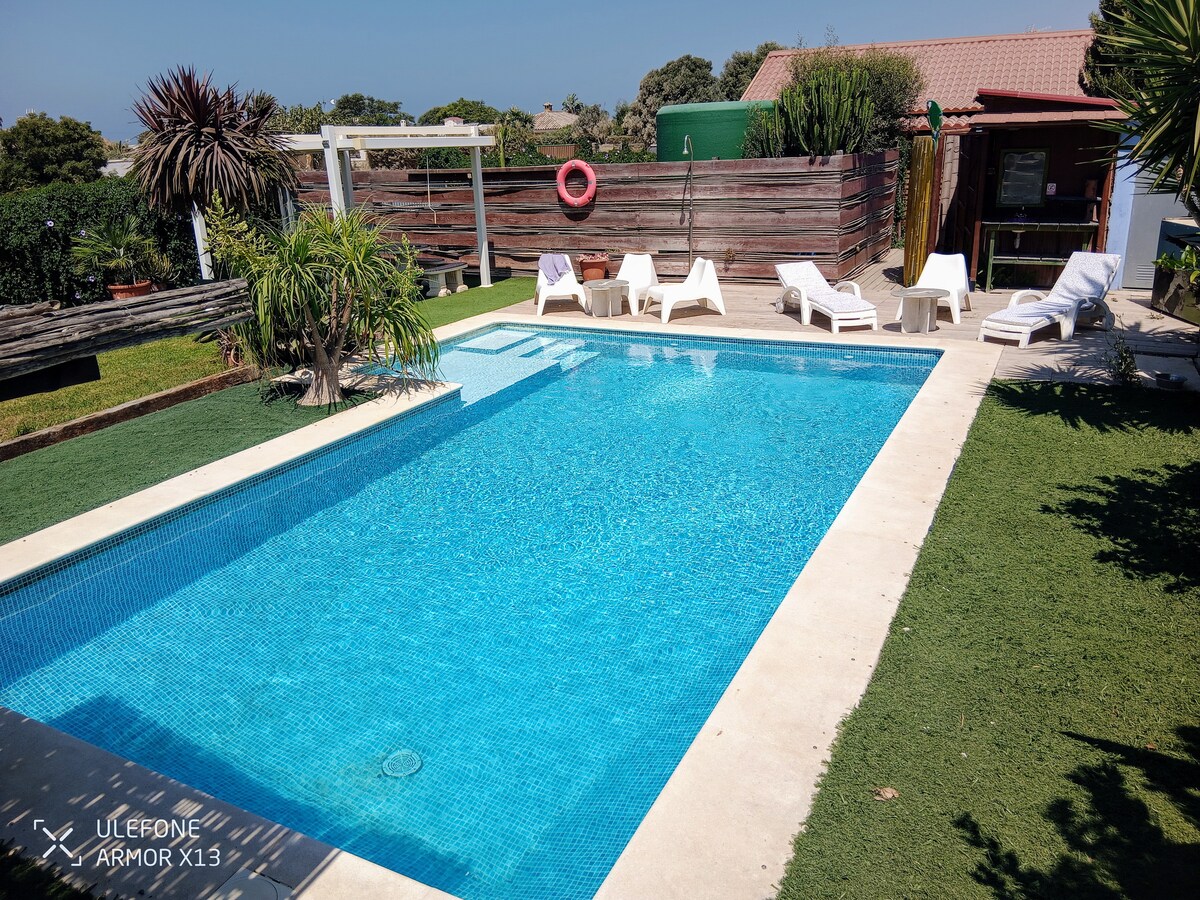 Excepcional villa individual en la playa de la Barrosa. Ubicación llena de luz, paz y tranquilidad y buenas sensaciones. Amplio jardín con piscina privada, barbacoa, 3 dormitorios, 2 baños, salón con chimenea, comedor, cocina, porche. Zona con todo tipo de servicios cercanos y fácil acceso, a 5 min.de la playa y 15 min del campo de golf de Sanctipetri, . Totalmente equipada para unas vacaciones perfectas. Si busca un lugar ideal esta preciosa casa, no le defraudará.