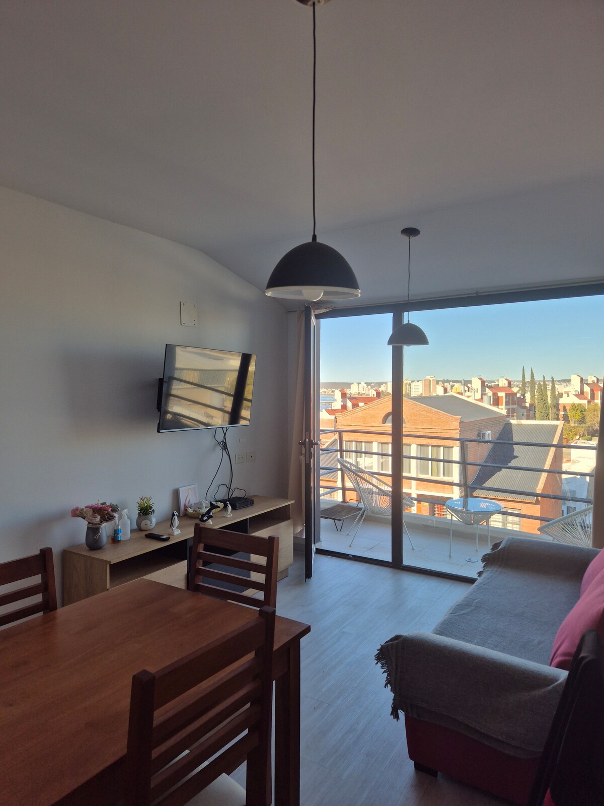 Departamento con hermosa vista al mar en un 5to piso, a 5 cuadras del centro comercial y 6 cuadras del muelle de Pto Madryn, con el acceso más cercano de la ciudad al mar. Apartment with beautiful sea view on the 5th floor, 5 blocks from the commercial center and 6 blocks from the pier of Pto Madryn, with the closest access from the city to the sea.
