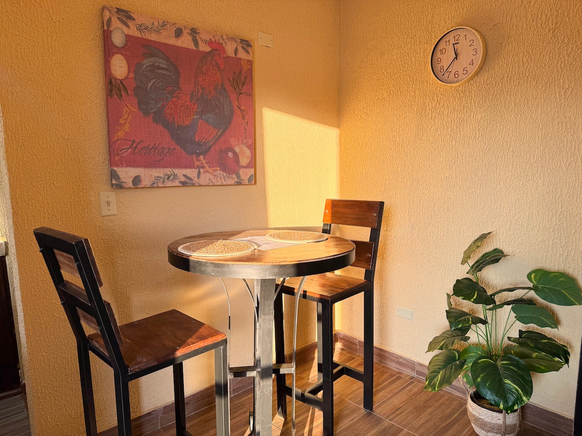 Vive la experiencia de hospedarte en este amplio, hermoso, elegante y cómodo apartamento. Tu auto estará en una area segura con cerca perimetral y cámaras de seguridad. A/C y Wifi en todo el apartamento, 2 TV smart. Tendrás una cocina completamente equipada. A menos de 2 minutos en auto podrás encontrar bares, restaurantes, cafetería, bancos, supermercados, farmacias y más. Estarás a sólo 50 metros de la vía interamericana y a 2 minutos de la vía Boquete y Tierras Altas.