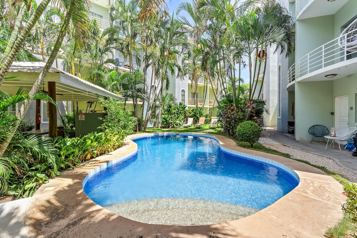 Apartamento equipado con todo lo que necesitas para corto o largo plazo de estadía. Internet rápido, ubicado en una rotonda residencial tranquila donde casi no circulan autos. A 300 metros de la playa, restaurantes, banco, supermercado, 100 metros del gym super céntrico. Puedes salir en la noche y volver caminando. Es normal ver en el patio, iguanas, monos aulladores, zorritos, Aves, ardillas etc. Los huespedes tiene descuentos en el surf shop Club 33 y además te ayudare a recomendarte otras act